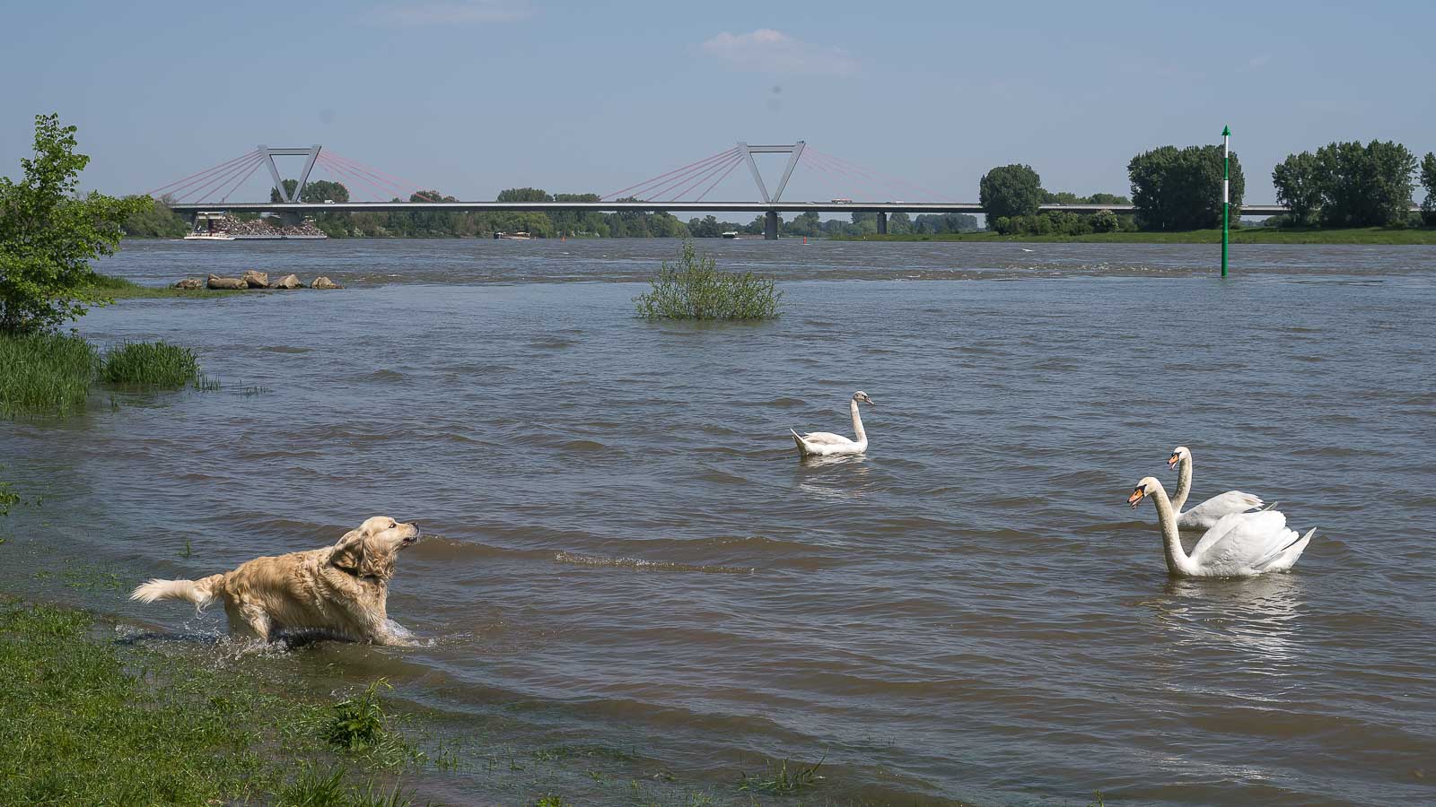 Am Ufer waren einige Spaziergänger unterwegs. Viele davon machten Picknick am Ufer, einige hatten ihre Hunde dabei. Einer davon wollte sich mit am Ufer herum schwimmenden Schwänen anlegen und kläffte sie wütend an. Diese zischten wehrhaft zurück und wußten sich im Wasser auf der sicheren Seite.