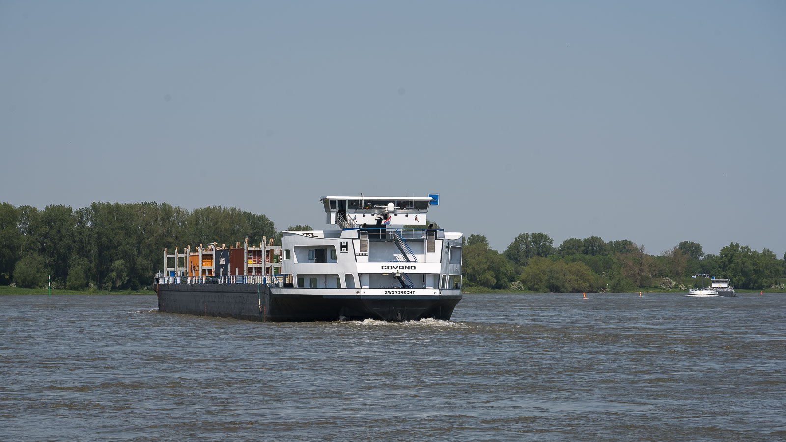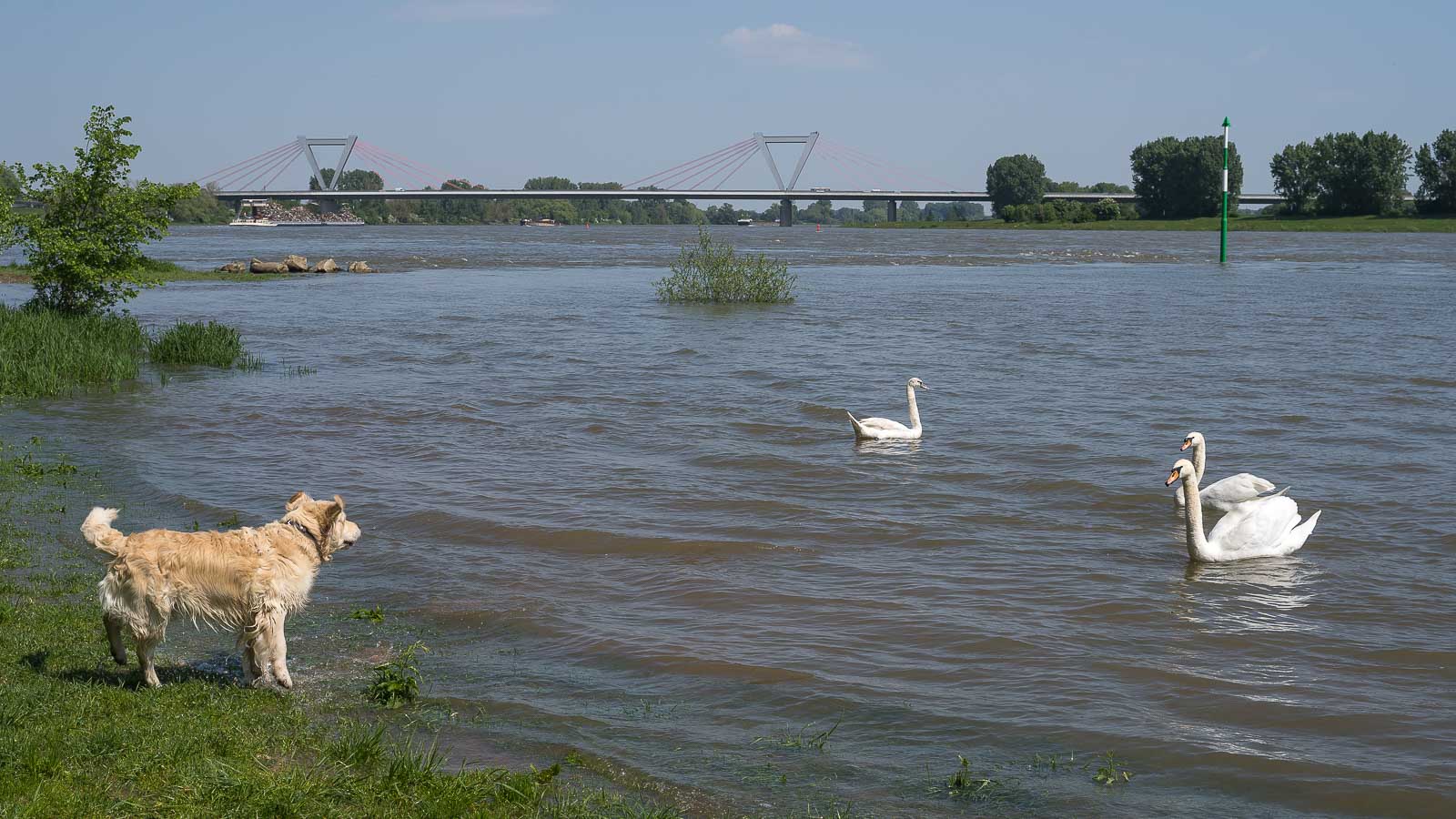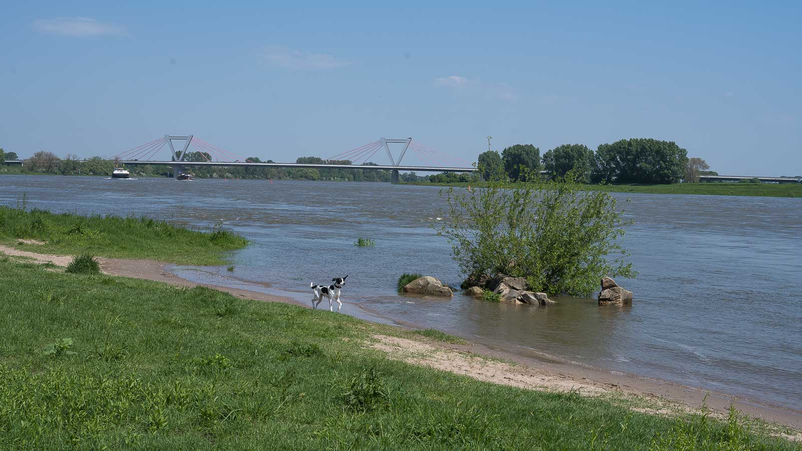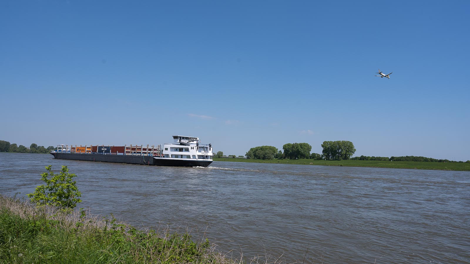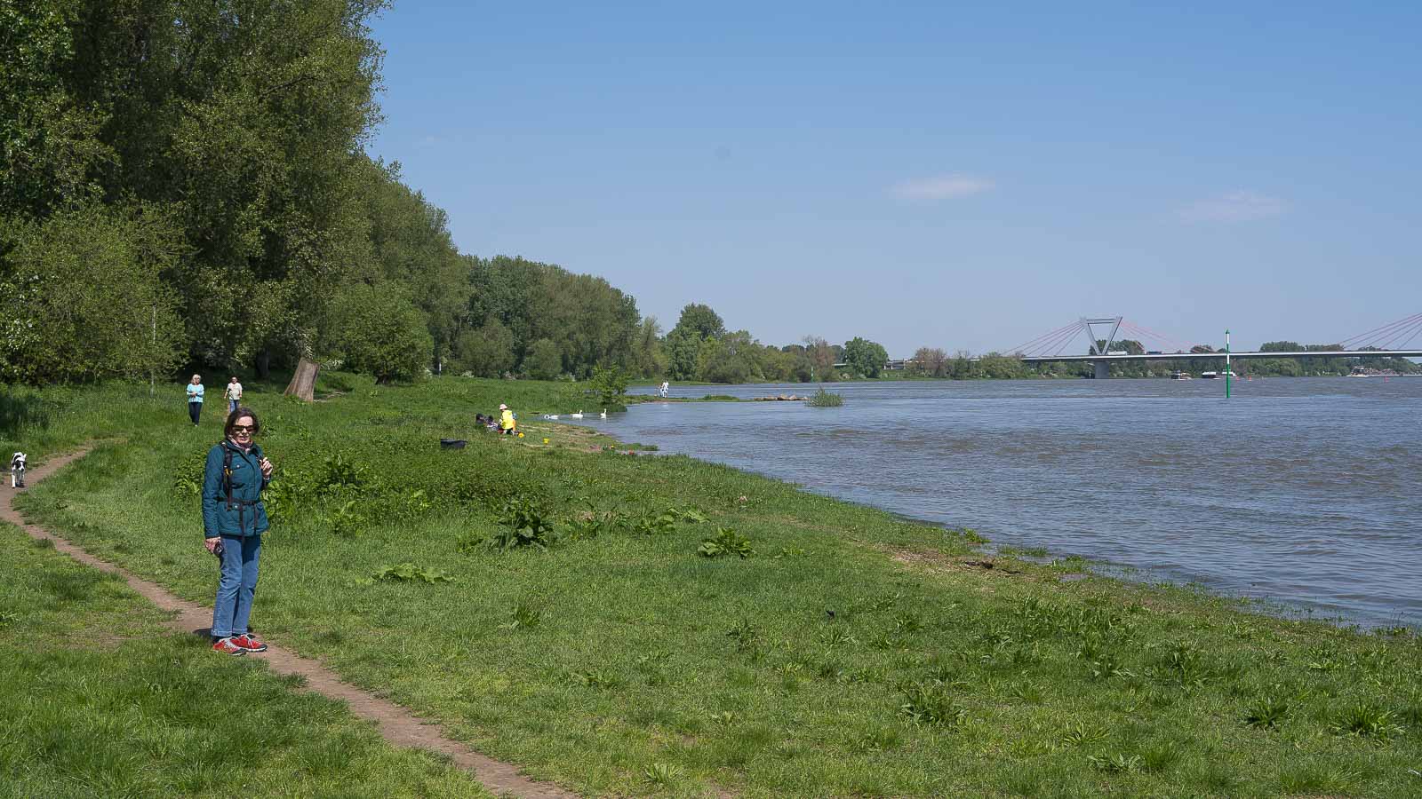 Kurz vor dem Rhein überquerten wir einen Deich und wanderten danach mehrere Kilometer direkt am Ufer entlang. Der Fluß war gut gefüllt und es herrschte einiges an Schiffsverkehr mit wegen des Wasserstandes gut beladenen Schiffen.