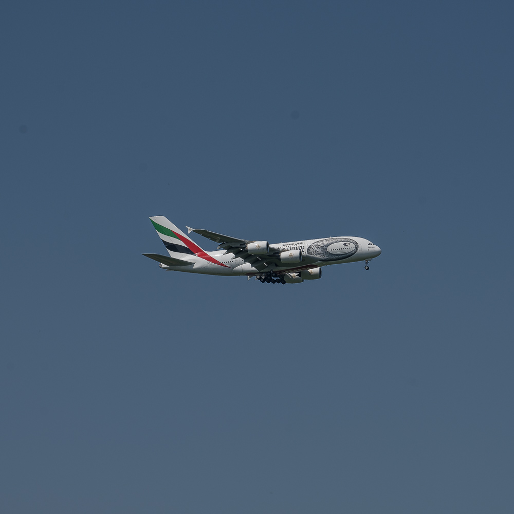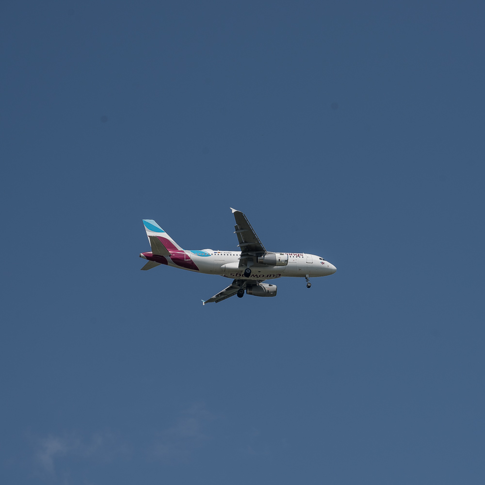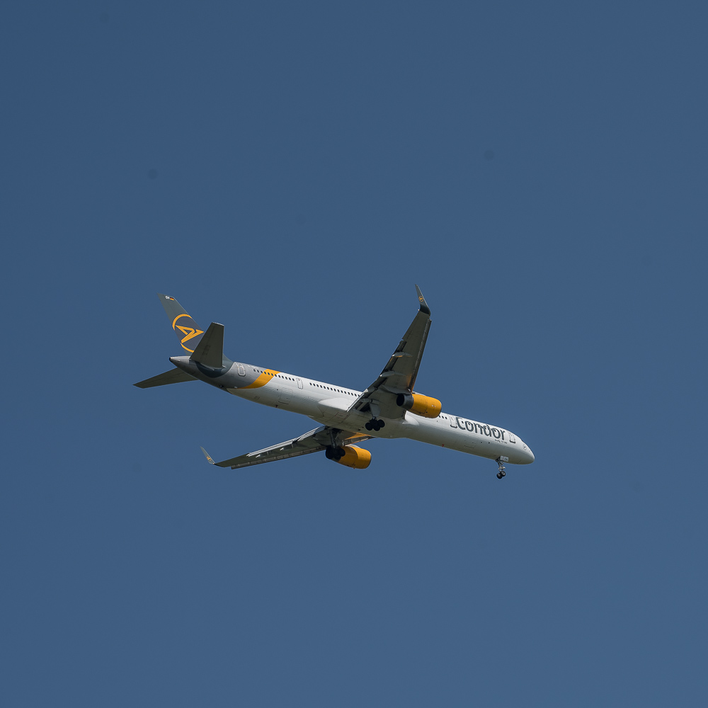 Nicht ganz passend dazu war das ständige Gebrumme der Flugzeuge. Direkt gegenüber von Meerbusch liegt auf der anderen Rheinseite der Düsseldorfer Flughafen und Meerbusch liegt direkt in seiner Einflugschneise. So donnerte alle 5 Minuten ein Flieger über uns hinweg. Wir verrenkten uns die Köpfe danach und ich fotografierte einige davon. Die meisten Bilder wurden jedoch später gelöscht. Bei den Spaziergängern konnte man die Einheimischen gut daran erkennen, das sie von dem Fliegern keine Notiz mehr nahmen. Auch deren Hunde schienen nicht mehr von einem Flieger beeindruckt zu werden der nur wenige Meter über ihre Köpfe hinweg donnerte.