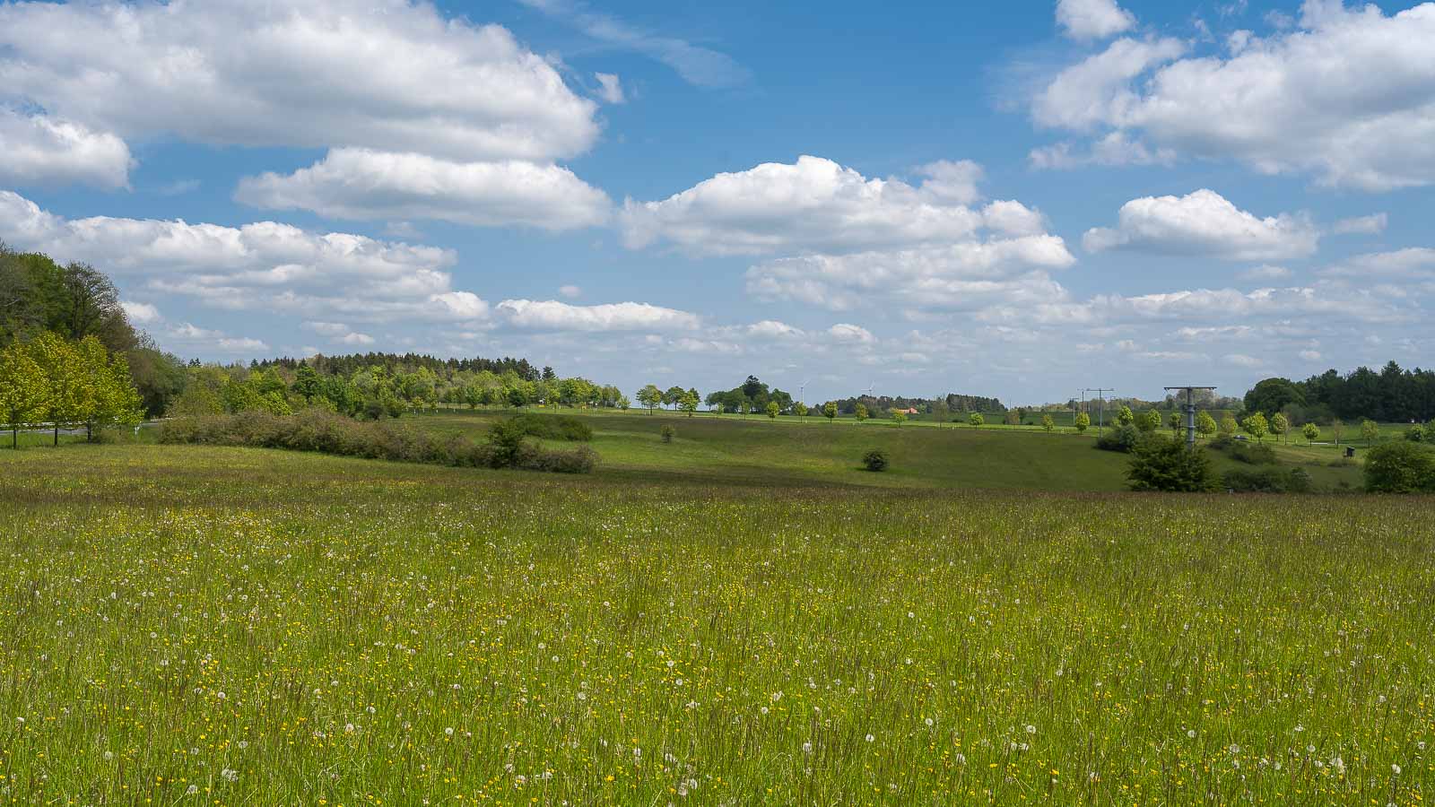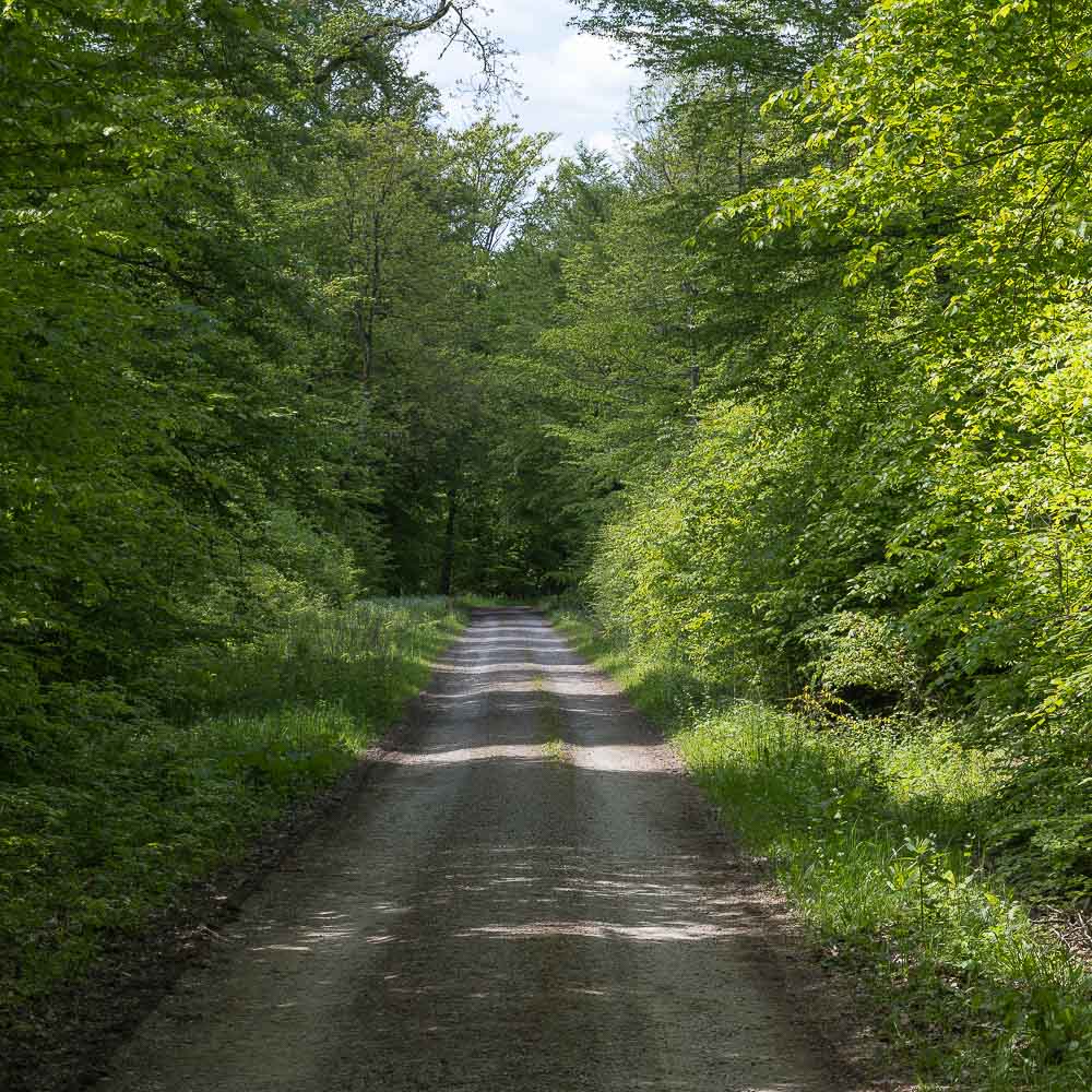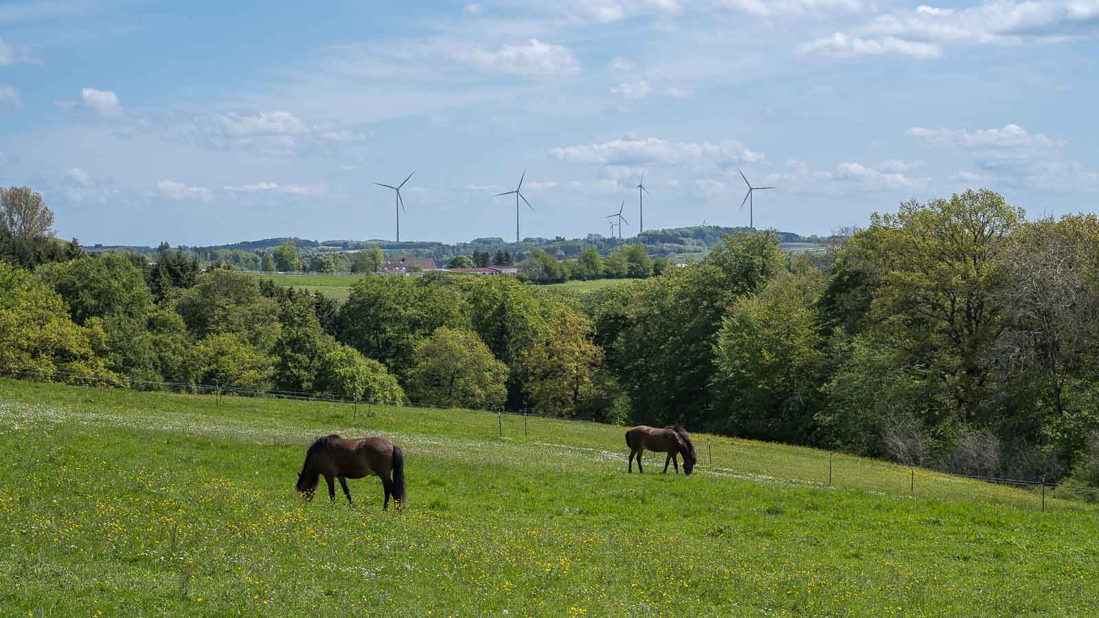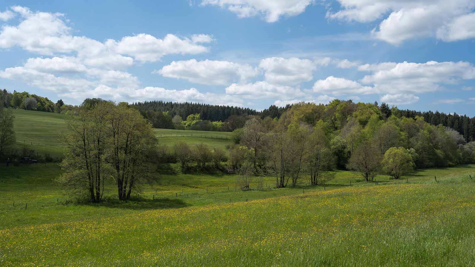 Die Wanderstrecke führt abwechselnd über offenes Gelände und durch den Wald. Das offene Gelände besteht überwiegend aus Wiesen, wir sahen nur wenig Ackerland. Das mag daran liegen das sich die Gegend auf einer Höhenlage von knapp über 500 m befindet und das Klima eher als herb zu bezeichnen ist. Auf den Weiden sahen wir viele Pferde und kaum Kühe. In den Wäldern dominierte Laubwald und im Gegensatz zum Bergischen Land sahen wir kaum tote Bäume und keinerlei wegen des Baumsterbens abgeholzten Freiflächen.