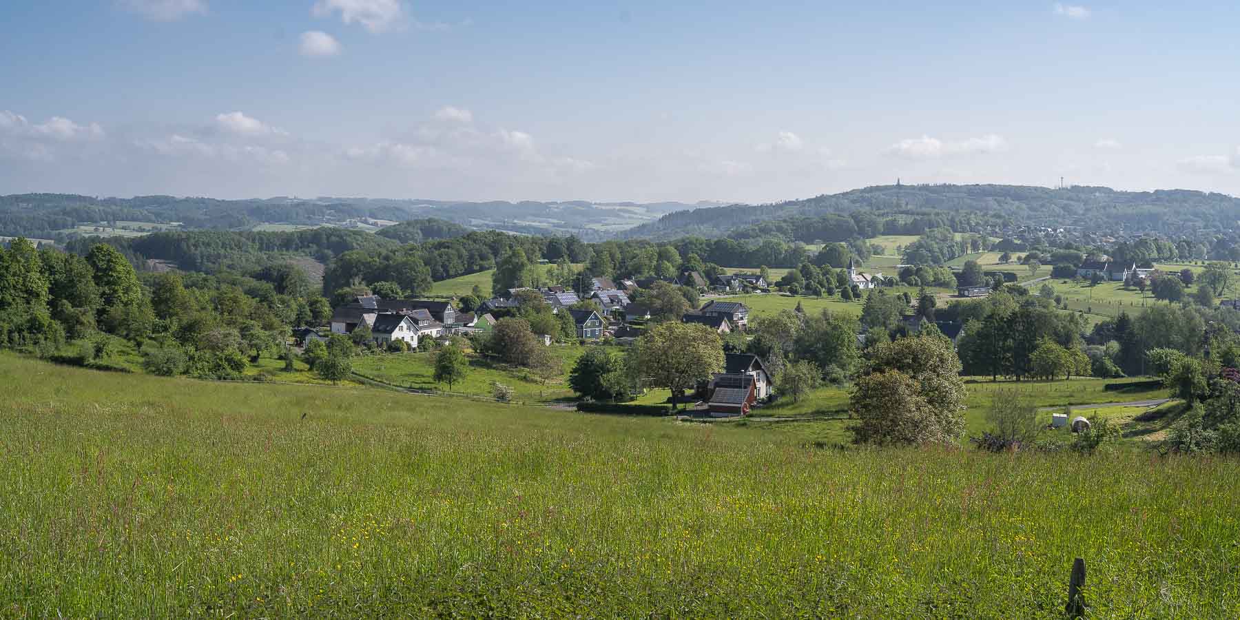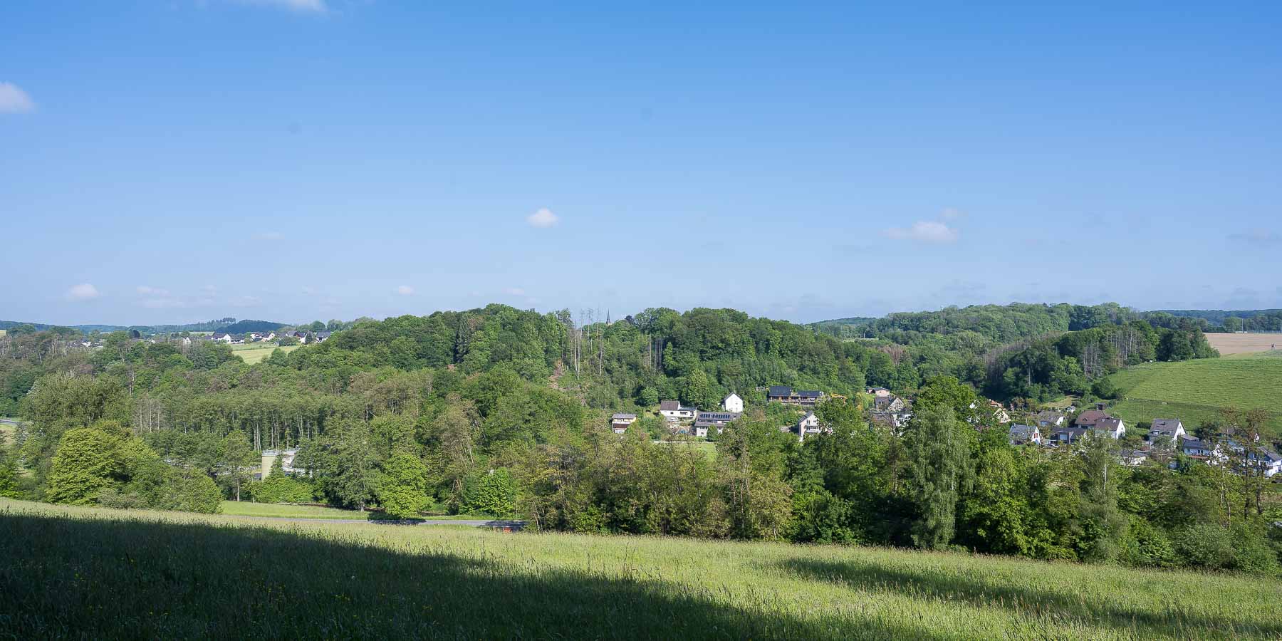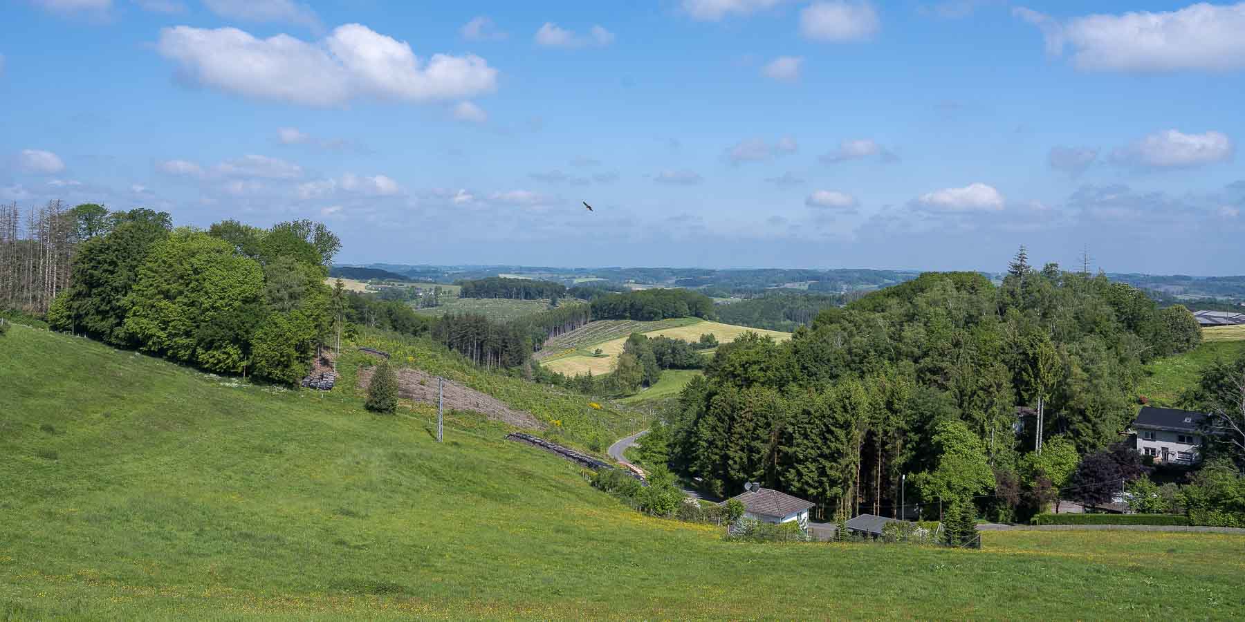 Die Wanderung führte oberhalb des Flugfeldes durch den Wald hindurch. Trotzdem hat man an einigen Stellen einen tollen Fernblick. Anschließend wanderte ich bergab in das Lennefer Bachtal und kam dort an einem Parkplatz des Freilichtmuseums zurück auf die L299. Von dort ging es ein kurzes Stück bergauf zur Nordseite des Freizeitparks. Für die Rückfahrt nach Leichlingen nahm ich wieder die Strecke über Neschen und genoß die weiter die schöne Aussicht.