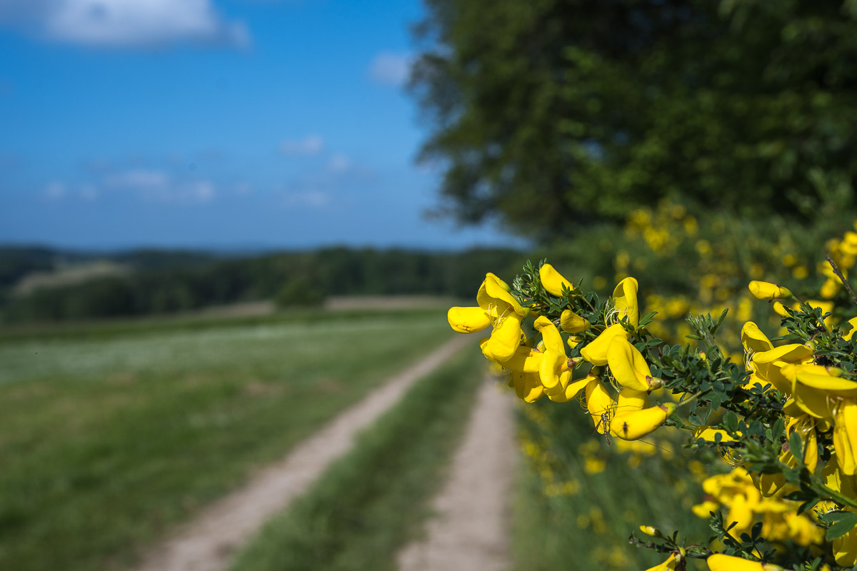 Das ganze Land war in ein sattes Grün getaucht wodurch mir die vorhandenen Brachflächen, die durch Abholzung wegen Borkenkäfer Befall entstanden waren, nicht so sehr ins Auge sprangen. Die Abholzung der befallenen Nadelbäume liegt mittlerweile vielfach schon 2-3 Jahre zurück. Auf den Freiflächen hat sich Folgevegetation gebildet, vielfach Ginster der gerade schön gelb am blühen war.