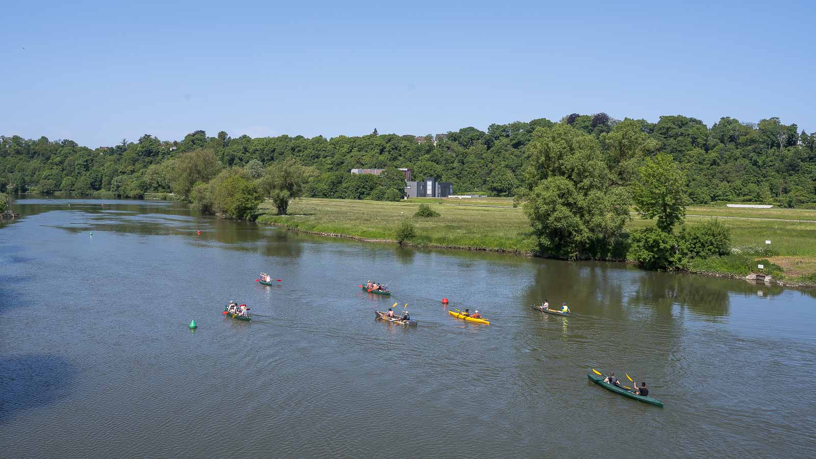 Ein kurzes Stück weiter kamen wir an die Ruhr, dort muß es auch Schiffsverkehr mit Ausflugsbooten geben, zumindest war auf meiner Open Street Map (Karte auf meinem Handy) eine entsprechende Eintragung. An der Nachtigall Brücke (nur für Fußgänger und Radfahrer) machten wir einen kleinen side-step nach rechts und genossen von der Brücke aus die Aussicht über die Ruhr. Der Zufall wollte es, daß gerade einige Kanuten die Brücke passierten und so meine Bilder etwas aufgepeppt wurden.