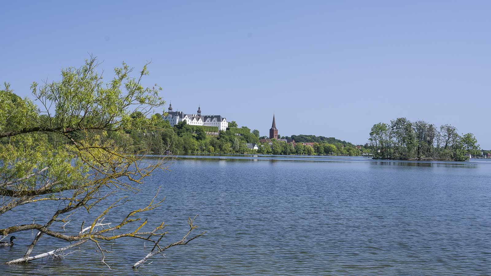 Und so fuhren wir in nur 8 Minuten mit der Bahn von Malente nach Plön (gleich die nächste Station) und erkundeten dort die Prinzenhalbinsel. Vom Bahnhof in Plön aus wanderten wir zunächst am Ufer entlang in Richtung der Halbinsel und genossen bei herrlichem Wetter die Aussicht auf den See und später, nachdem wir etwas gewandert waren, auf Plön mit seinem auf einem kleinen Hügel liegenden Schloss.