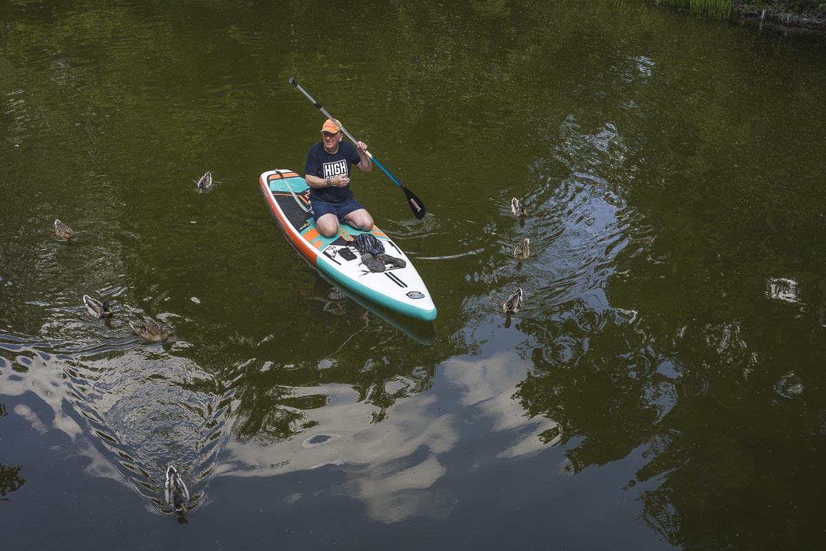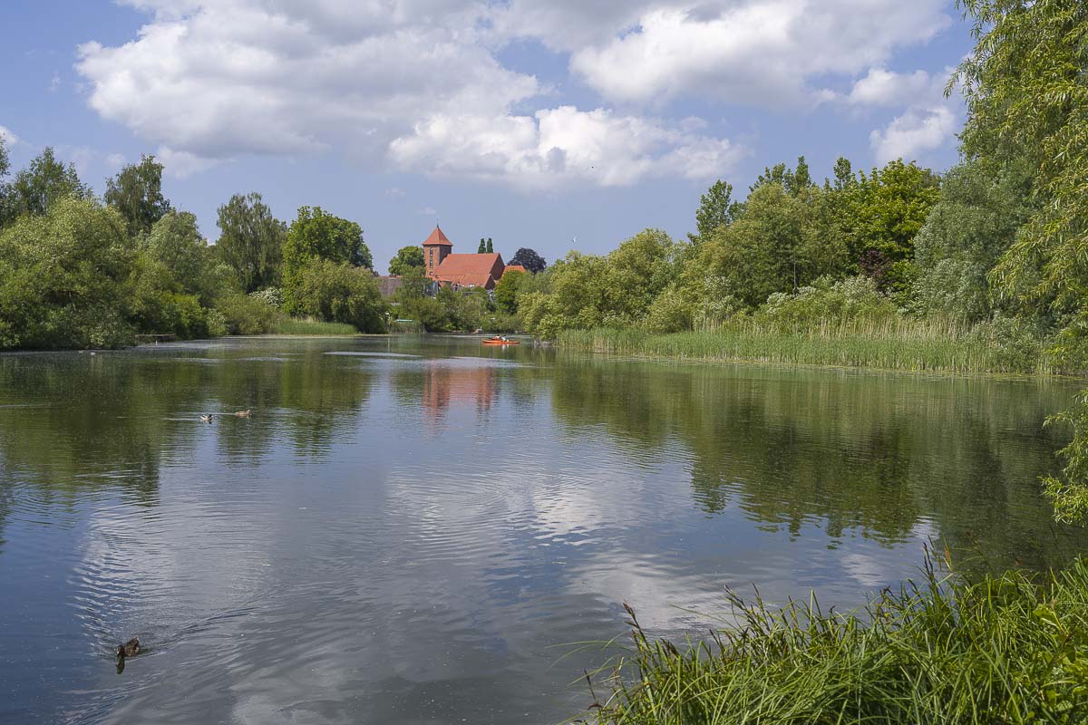 In Preetz angekommen zog es uns in die Fußgängerzone, wo wir für Café – Cappuccino in einem Eissalon stoppten. Mit einem „Leckeis“ in der Waffel zogen wir dann weiter. Es folgte die schönste Etappe der Wanderung um den Kirchsee. Dort waren Stand-Up Paddler und Kajakfahrer unterwegs. Ein Paddler wurde von einigen Enten begleitet. Von einer Brücke aus konnte ich ihn um Erlaubnis für ein Foto bitten. Er gestand mir dabei, daß er die Enten angefüttert hatte damit sie folgen sollten.