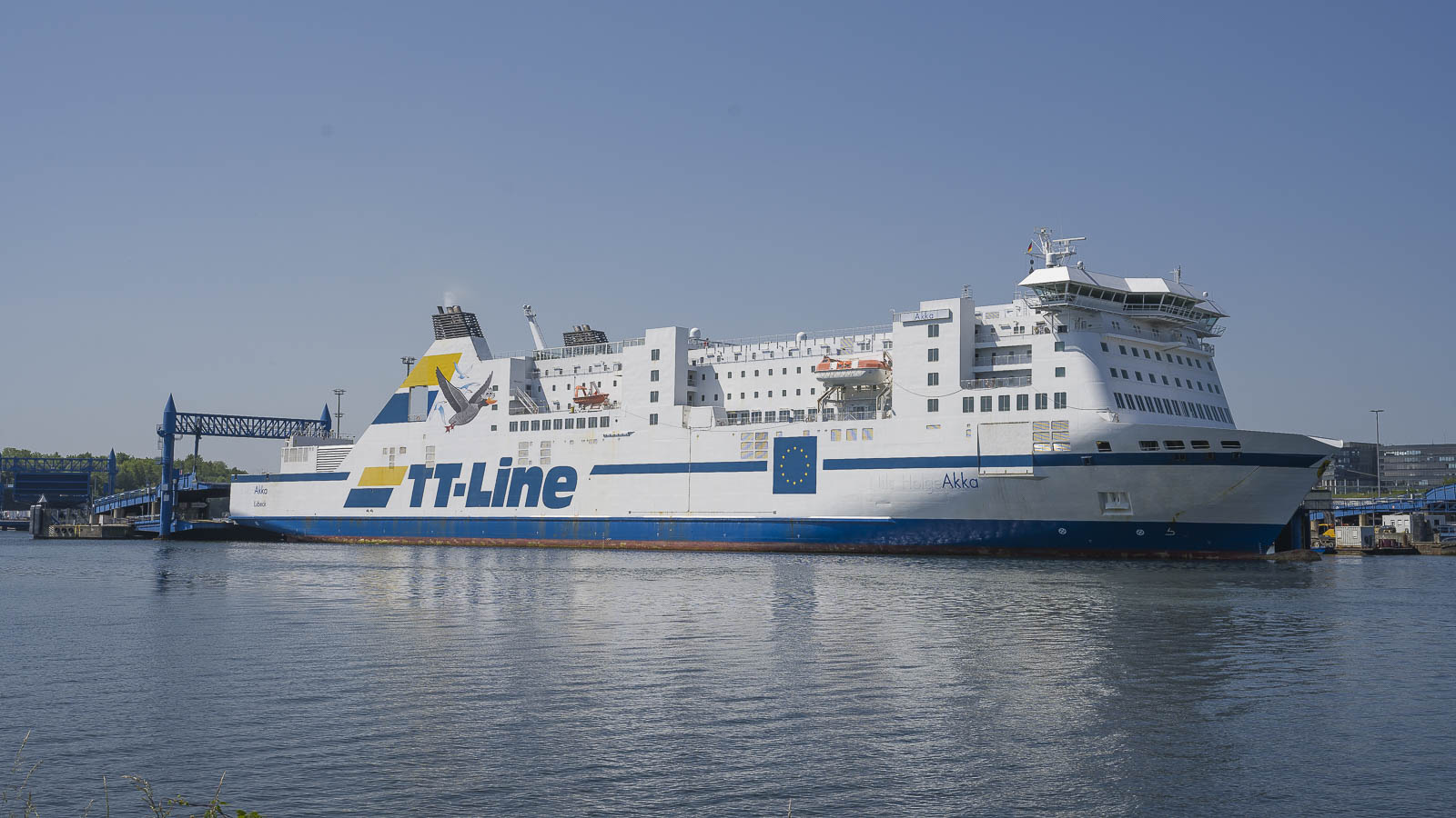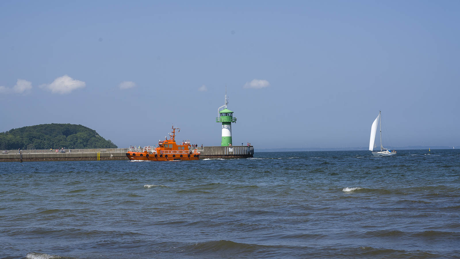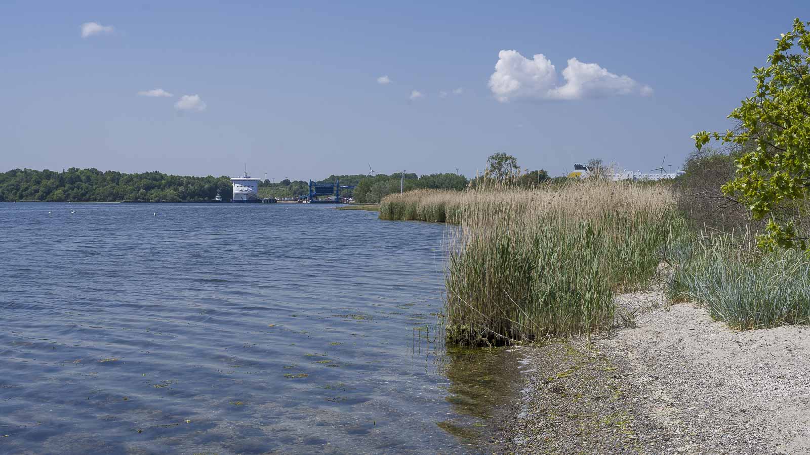 Zunächst wanderten wir entlang der Küstenlinie zur Südspitze der Halbinsel. Dabei beobachteten wir den Schiffsverkehr in der Bucht. Von Travemünde aus gibt es einige Fährverbindungen in die skandinavischen Länder. Ein Fährschiff fuhr gerade an uns vorbei und ein anderes hatte schon an einer von mehreren Anlegestellen angedockt. Aber auch einige kleinere Boote/Schiffe waren hier unterwegs.