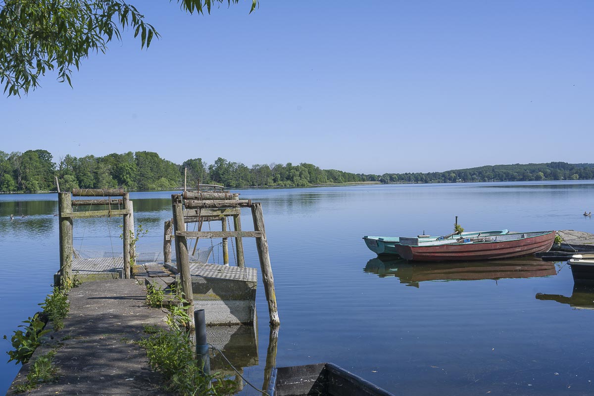Der Track (siehe Karte) macht hier einen kleinen Schlenker nach rechts und führt an einem Restaurant vorbei zum See. Man muss also etwas aufpassen um diese schöne Stelle nicht zu verpassen. Hinter dem Anleger geht der Weg ein ganzes Stück auf einem kombinierten Rad-Fußweg parallel zur Strasse bevor er rechts ab in einen Wald abbiegt und man nun entlang des Fehler Sees wandert. Wegen des Waldes bekommt man von dem See aber nicht so viel zu sehen.