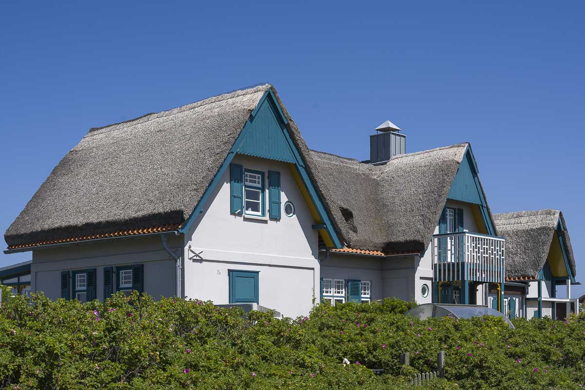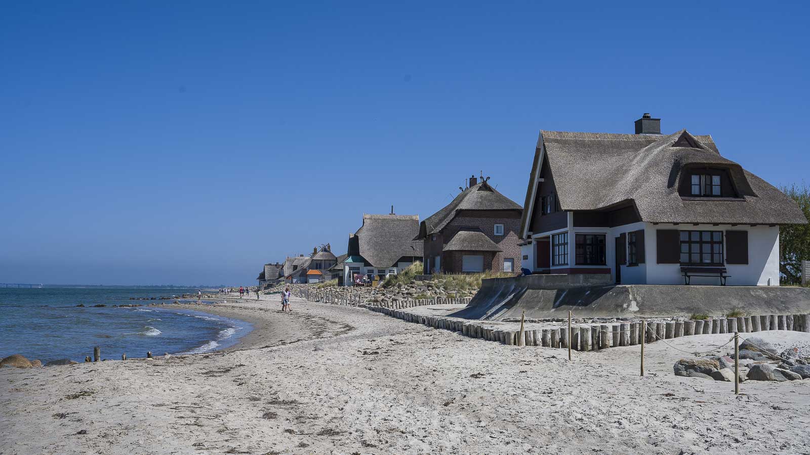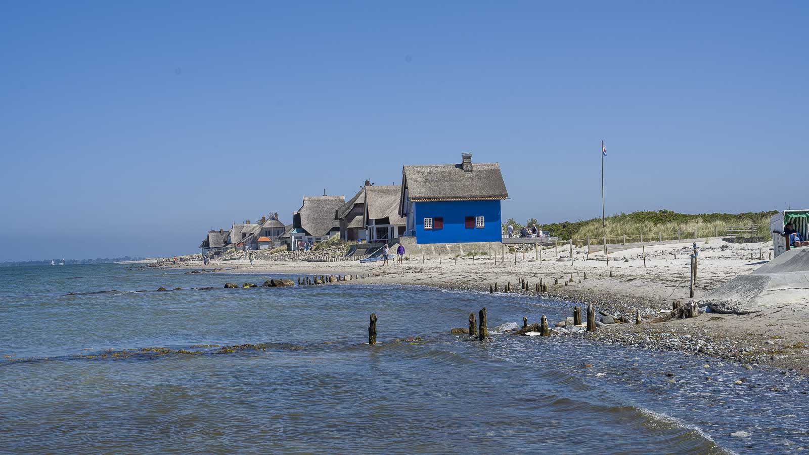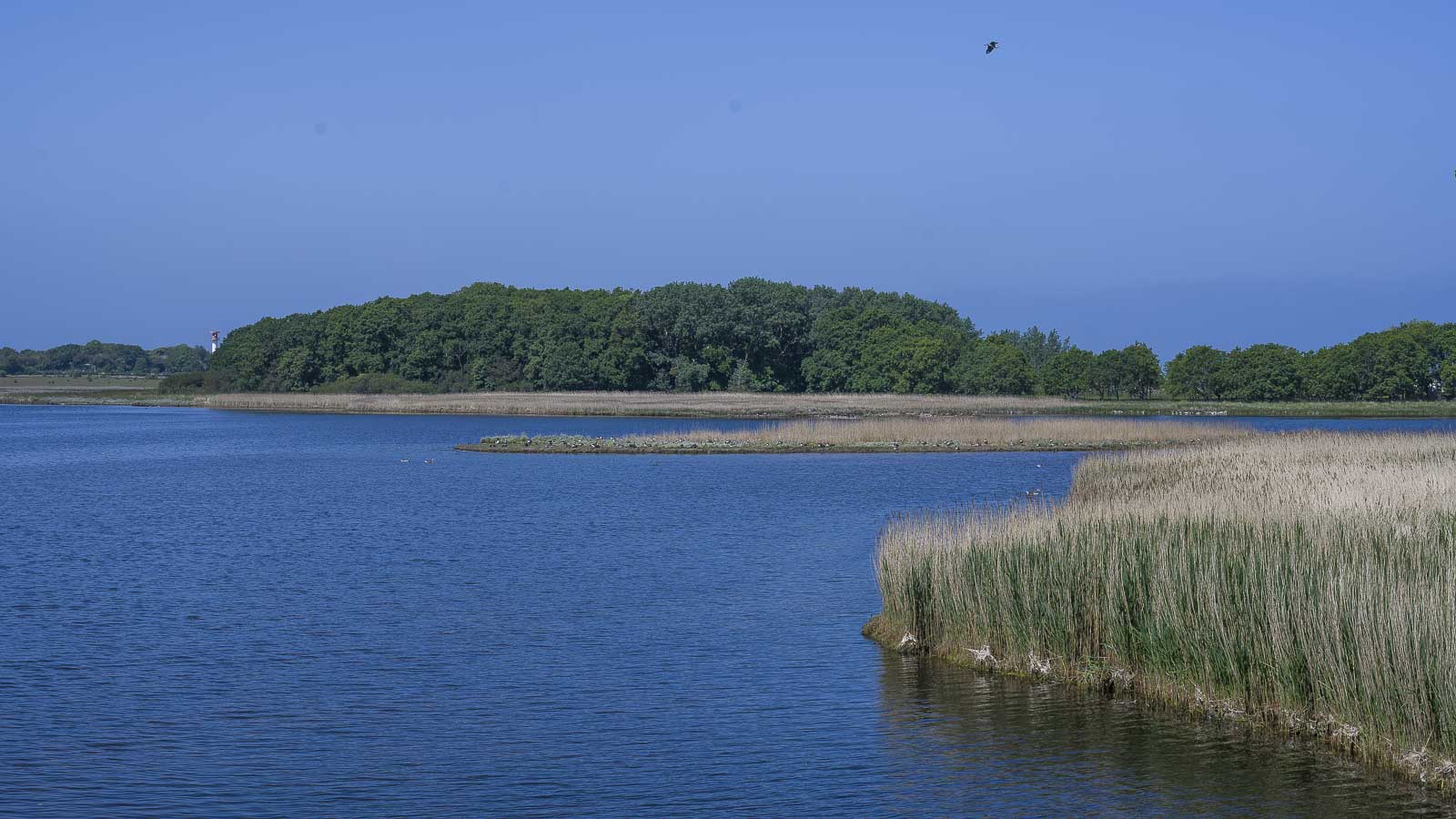 Diese führte uns dann auf die Halbinsel Graswarder, an deren Ende sich ein Vogelschutzgebiet mit einem Aussichtsturm befindet. Auf dem Hinweg wanderten wir auf der dem Meer abgewandten Seite. Rechts des Weges lagen die üblichen Salzwiesen und links standen in einer langen Reihe zahlreiche ältere, z.T. noch Reet gedeckte Ferienhäuser.