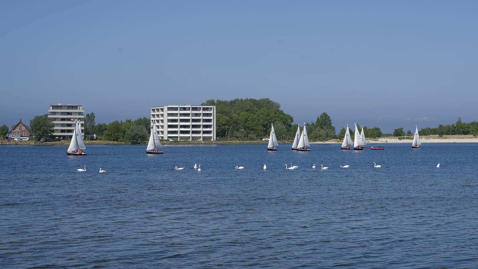 Nach ca. einem Kilometer war das dann vorbei und wir kamen wieder an der Seebrücke an. Durch die „Fressgasse“, hier spielte gerade eine Blaskapelle, ging es dann wieder zum Jachthafen und von dort zu dem Binnensee. Auf diesem war gerade eine Segelschule mit viele kleinen Booten unterwegs. Von unserem Parkplatz aus starteten wir die Rückfahrt nach Malente, die wie fast alle Autofahrten in dieser Gegend ohne Staus von statten gehen (da sind wir aus unserer Heimat anderes gewöhnt).
