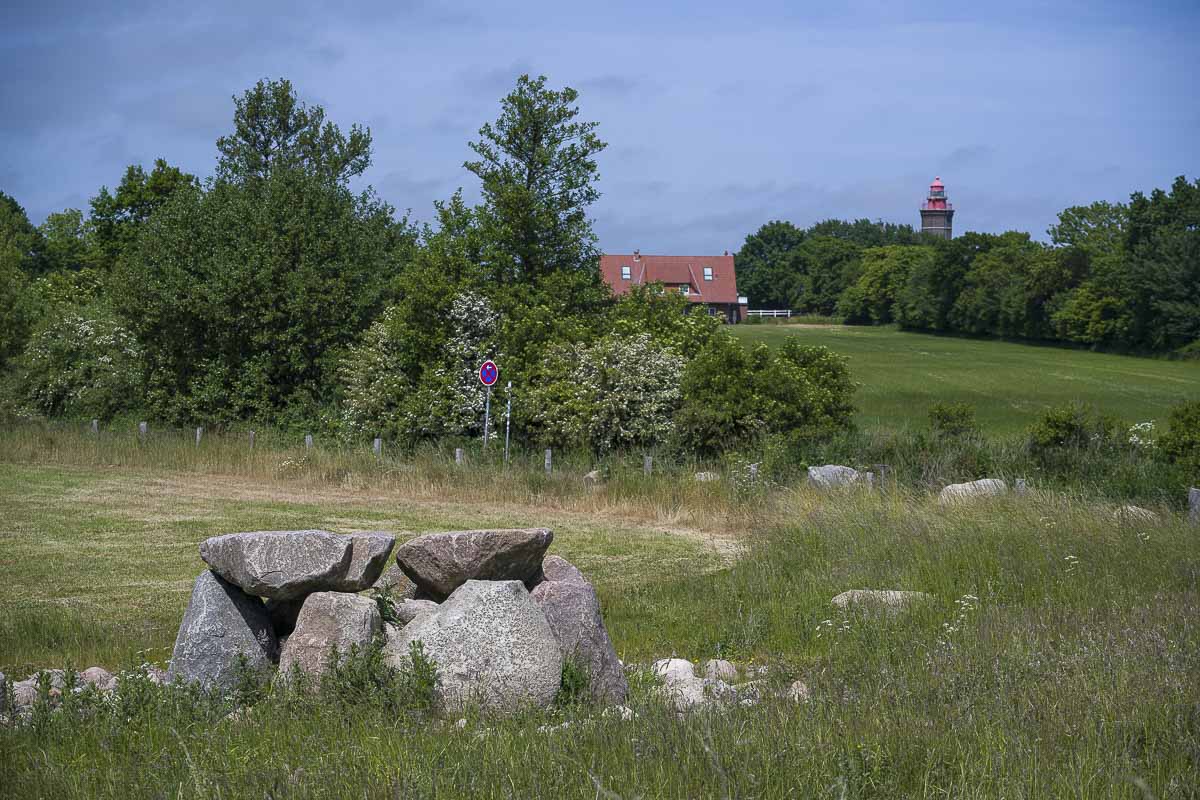Am Ende der Promenade führte der Track unserer Wanderung eigentlich am Strand entlang. Wir nahmen den Weg kurz in Augenschein, entschieden uns dann aber für die leichtere Variante entlang einem parallel zur Küste verlaufendem kleinen Sträßchen-Radweg. Der Strandweg wäre uns zu steinig gewesen. Nach etwa 500 m kamen wir an einer Jugendherberge vorbei und machten dort einen Abstecher in Richtung Strand. Der Weg dort erschien uns aber immer noch nicht Ü70 tauglich und so wanderten wir auf dem Radweg weiter bis zu dem Leuchtturm Dahmeshöved. Den gibt es sogar auf einer Briefmarke :