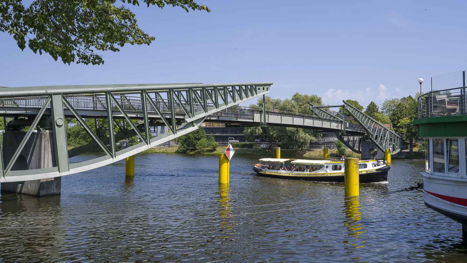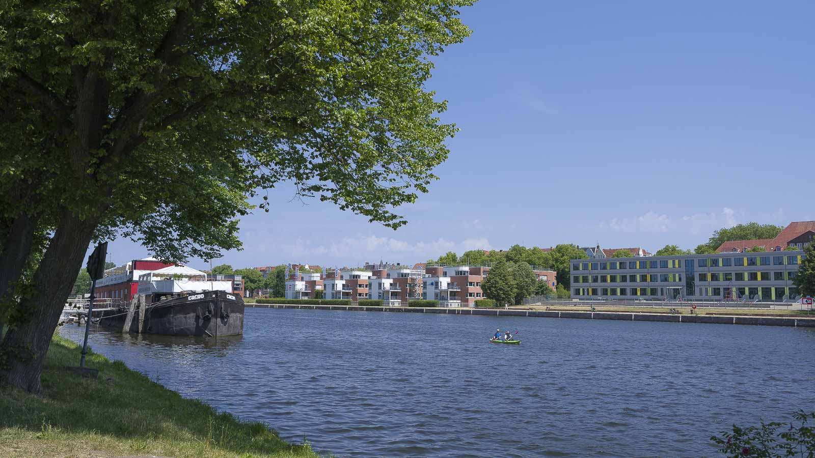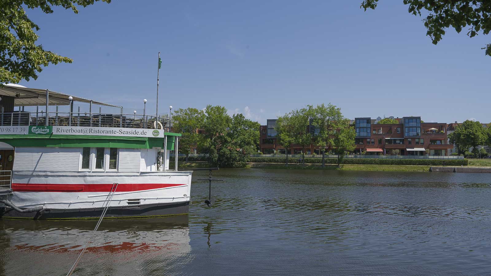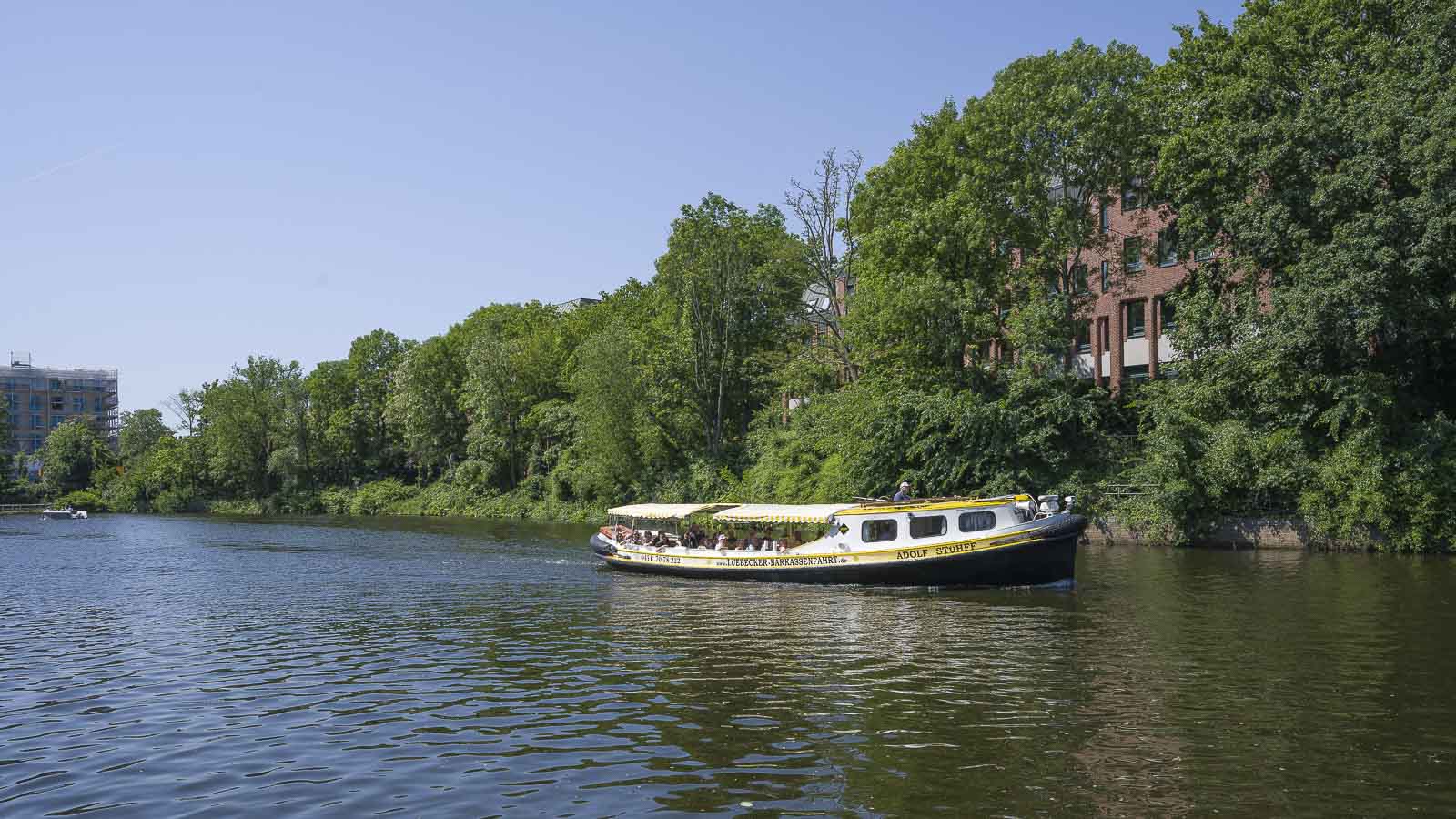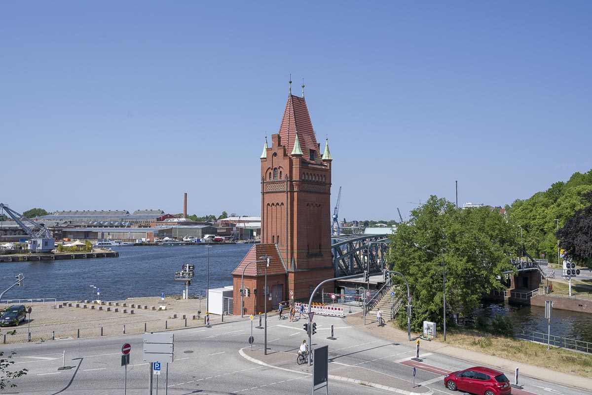 Hinter der Rederbrücke kamen wir an den Elbe Lübeck Kanal, an dem einige Hotel- bzw. Partyschiffe festen Anker geworfen hatten. Auf der gegenüberliegenden Kanalseite gab es einige attraktive Neubauten mit schicken Wohnungen.
