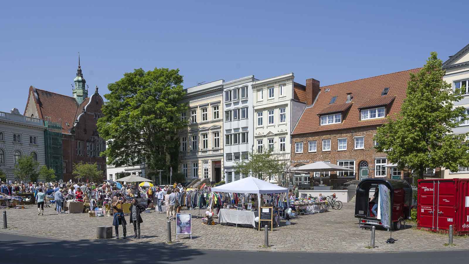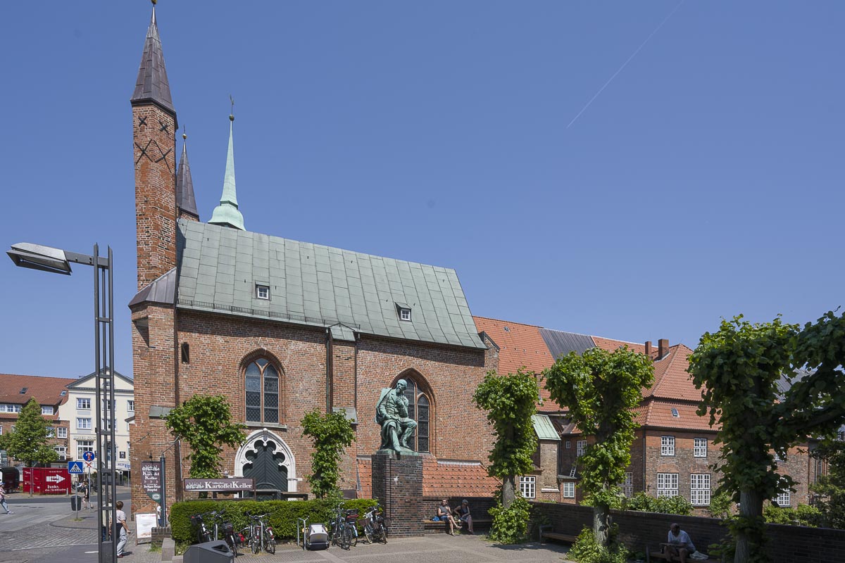 Vorbei am Willy Brand Haus und an der St.-Jakobi Kirche kamen wir zum Koberg Platz an dem gerade ein Floh Markt abgehalten wurde. Danach machten wir einen kleinen Rechtsschlenker durch die Große Gröpelgrube und entlang der Wakennitzmauer. So entkamen wir etwas dem Touristenrummel. Vor dem Burgtor Museum, im Ida Boy-Ed Garten, fanden wir eine Bank für unsere Mittagspause und verzehrten unsere Marschverpflegung.