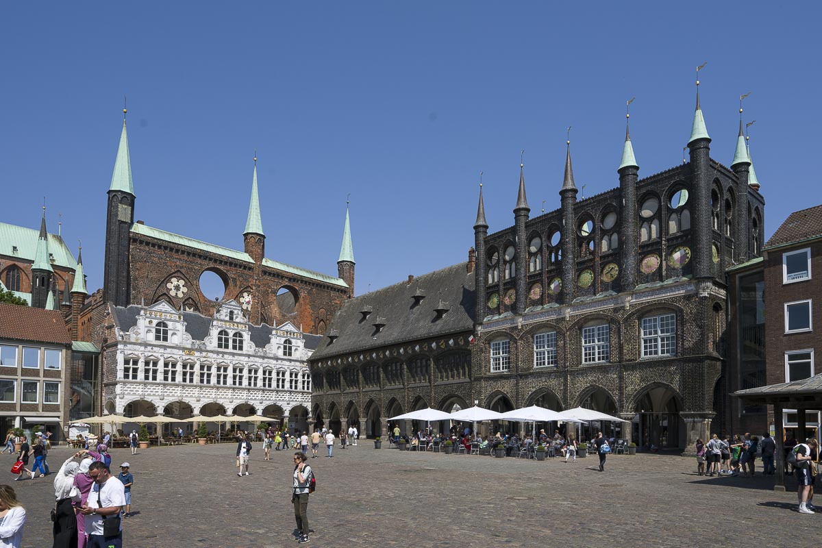 Vorbei am Europäischem Hansemuseum wanderten wir zurück zum Koberg Platz entlang der Breite Straße. Hier säumten die üblichen Geschäfte einer mittelgroßen Europäischen Stadt unseren Weg (H&M, Karstadt, Zara, Gerry Weber, etc. etc.). Um die St. Marienkirche machten wir einen Schlenker und entkamen so dem Konsum Rausch. Danach erreichten wir das alte Rathaus mit dem Marktplatz. Das wiederum war schon beeindruckend. Die Altstadt von Lübeck wurde wohl nicht zu Unrecht in das UNESCO Weltkulturerbe aufgenommen.