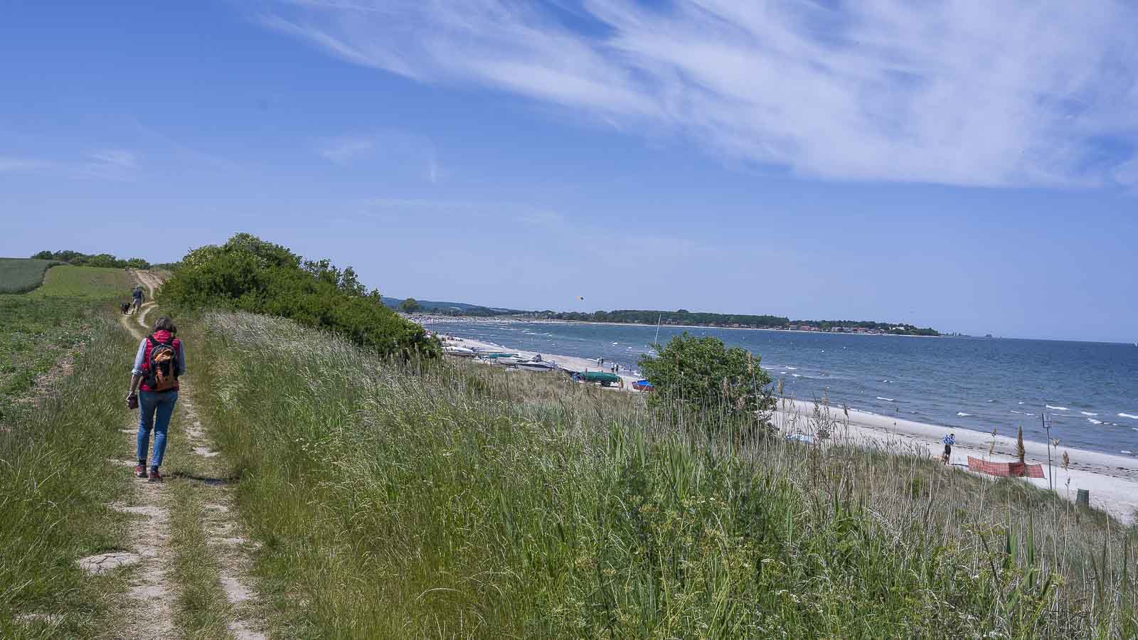 Nach etwa 6 Kilometern gelaufener Gesamtstrecke verließen wir den Strand und bogen nach rechts ab und wanderten oberhalb des Strandes wieder zurück. Der „Aufstieg“ auf die Steilküste ging durch ein Gebüsch und war recht steil. Er war nicht unbedingt Ü70 tauglich und wir waren froh als wir oben ankamen. Dafür wurden wir mit einer schönen Aussicht über den Strand belohnt. Später, auf der Höhe der landeinwärts liegenden Campingplätze, führte der Weg lange Zeit über diverse Parkplätze. Wer dies vermeiden möchte, kann am Strand die gleiche Strecke wieder zurück laufen.