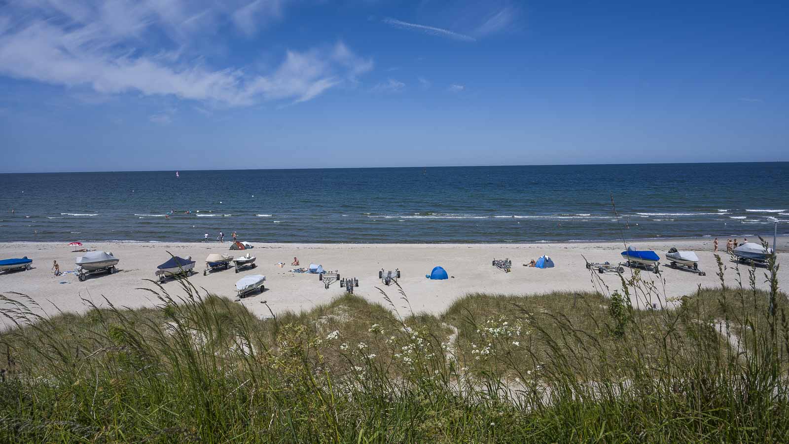 Nach etwa 4 gelaufenen Kilometern bogen wir links ab und wanderten zum Strand. Dies war dann der schönste Teil der gesamten Wanderung. Der Strand ist sehr lang, ausreichend breit und bietet Platz für alle. Einige Mutige stürzten sich sogar in die kalten Fluten, die meisten Badegäste blieben aber draußen. An einem Bootsverleih können verschiedenste Wassersportgeräte ausgeliehen werden. Am Strand lagen aber auch viele Segelboote und kleinere Motorboote die von Gästen des hinter dem Strand gelegenen Campingplatzes dort auf Trailern abgestellt worden waren.