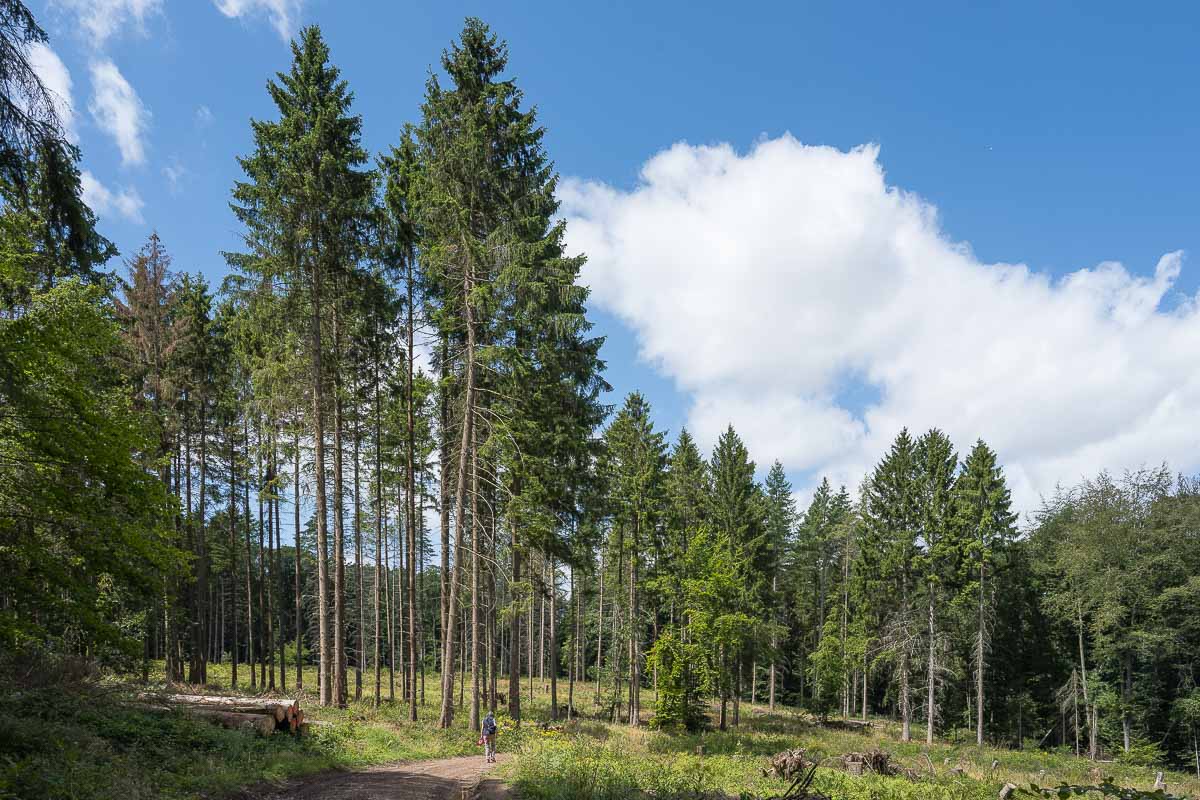 Wir starteten die Rundwanderung, wie im Track vorgesehen, im Uhrzeigersinn. Die Wanderwege sind sehr breit und durchgehend Kinderwagen tauglich. Lediglich an zwei Stellen müssen einige größere Pfützen, die von Forstfahrzeugen erzeugt wurden, umfahren werden. Auch die Steigungen sind allesamt leicht zu bewältigen und locker Ü70 tauglich.
