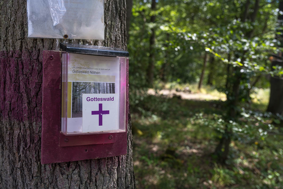 Nach fast der Hälfte der Strecke kamen wir zu einem „Gotteswald„. Hier kann man sich im Wald christlich bestatten lassen. Entsprechendes Prospektmaterial lag vor Ort aus.