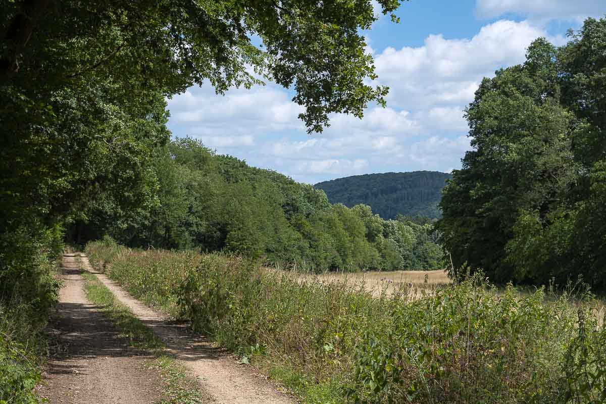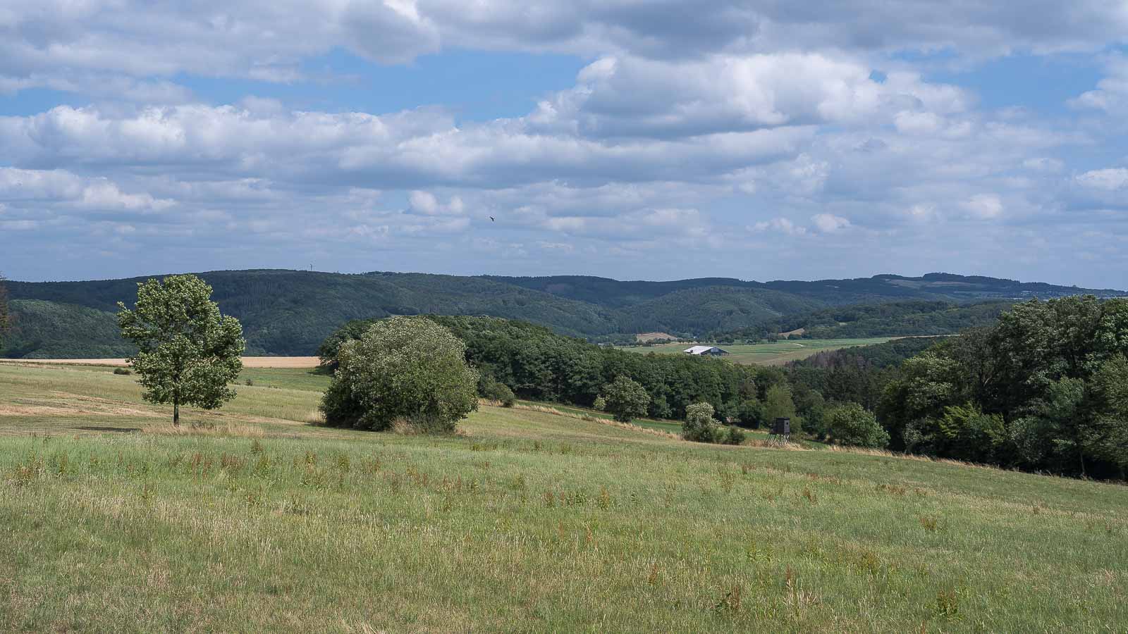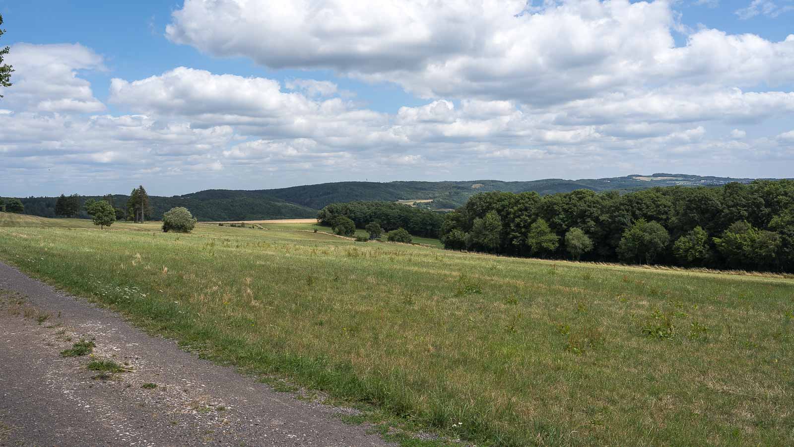 Hinter dem Ort Höhn, schon kurz vor dem Wanderparkplatz, verlief unser Weg am Waldrand entlang und bot eine schöne Aussicht über die Eifel. Passend zur Aussicht fanden wir eine Bank auf der wir pausierten und unsere Marschverpflegung verzehrten. Wir hatten die ganze Gegend für uns, keine Menschenseele war hier unterwegs.