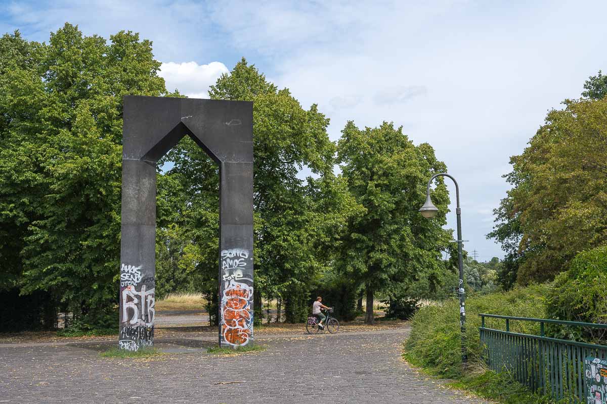 Nach Verlassen der S-Bahnhaltestelle überquerten wir die breite Allee „Auf’m Hennekamp“ und betraten auf der anderen Straßenseite den Volkspark. Gleich am Eingang sahen wir eine künstlerische Installation von 24 Uhren (Beitragsbild).