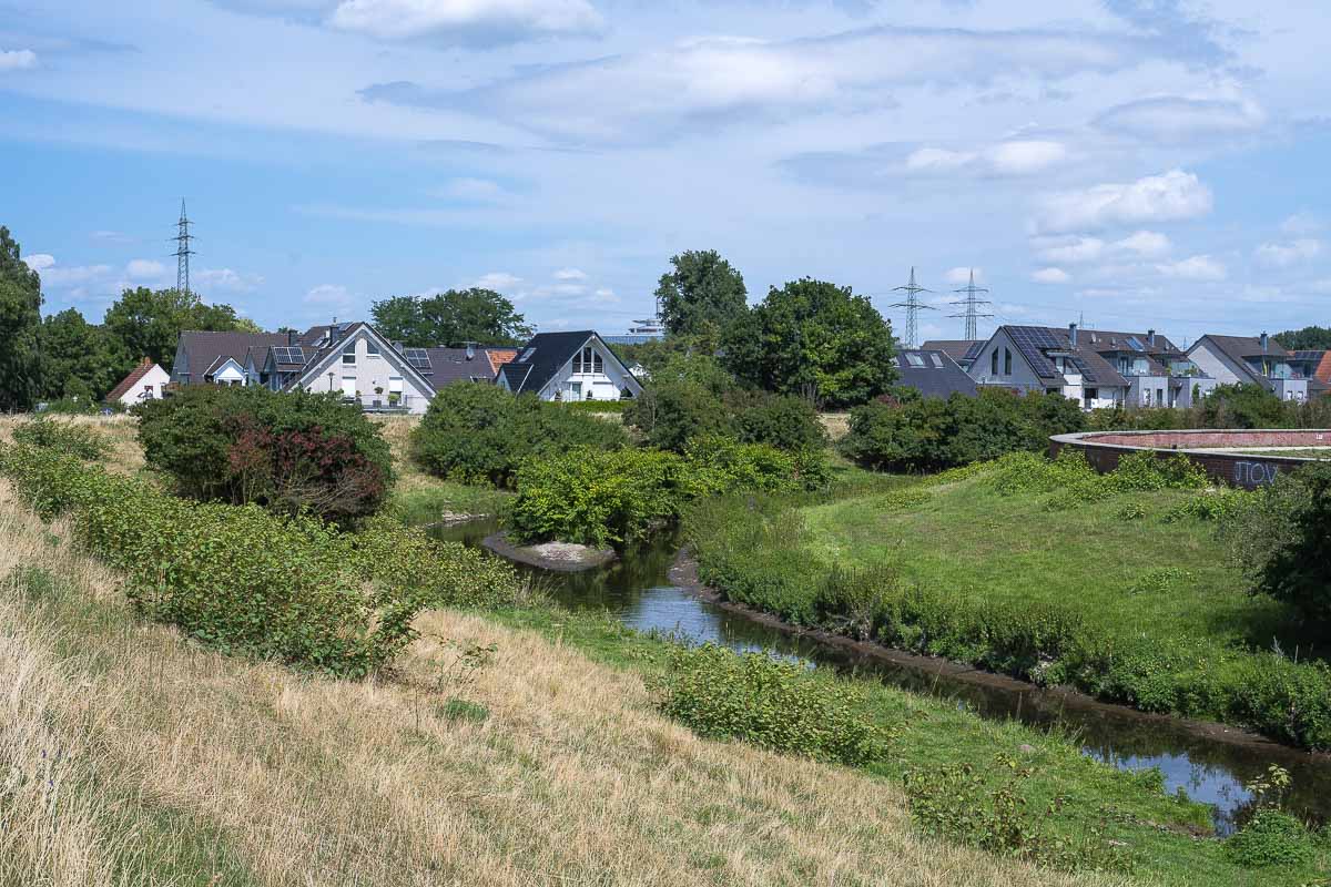 Sehr schön ist das ganze Gelände für Familien mit kleinen Kinder. Es gibt verschiedene sehr große Spielplätze und einige Wasserspiele an bzw. in denen sich die Kleinen erfreuen können. Auch an einem Streichelzoo sind wir vorbei gekommen. Nach etwa 3 km verläßt man der Park, überquert die A46 und gelangt an den Unisee. Dieser ist eingezäunt und man kann nur gelegentlich einen Blick auf den sehr großen See erhaschen. Hinter dem See wanderten wir entlang des Brückerbaches auf einem Deich wo wir eine schöne Pausenbank fanden.