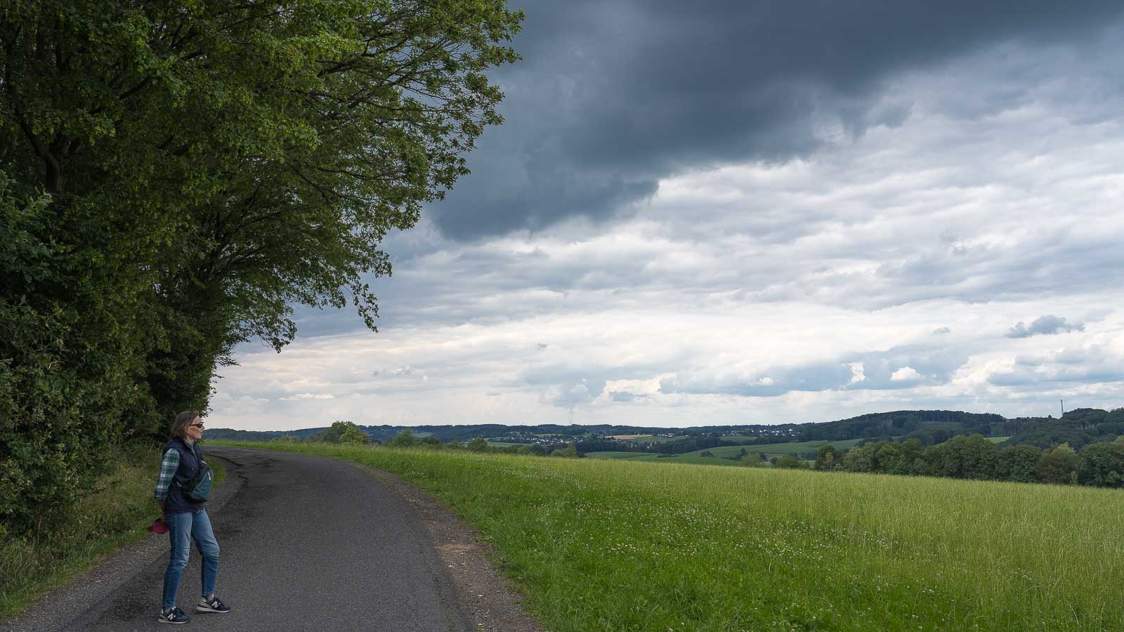 Das Wetter war zunächst heiter bis wolkig, später zog es dann immer mehr zu und am Horizont dräuten dunkle Wolken herauf (siehe Beitragsbild). Zum Glück blieb es aber trocken. So in etwa am höchsten Punkt der Runde (etwa 330 m) bogen wir links ab in Richtung Holzer Hof, einem wirklich großem Bauernhof. Nun ging es langsam aber stetig weiter bergab, zunächst noch auf naturbelassenen Wegen, später dann auf einer wenige befahren asphaltierten Fahrstrasse etwa 4 km geradeaus nach Hohkeppel. Unterwegs hatten wir eine tolle Aussicht über das bergische Buckelland.