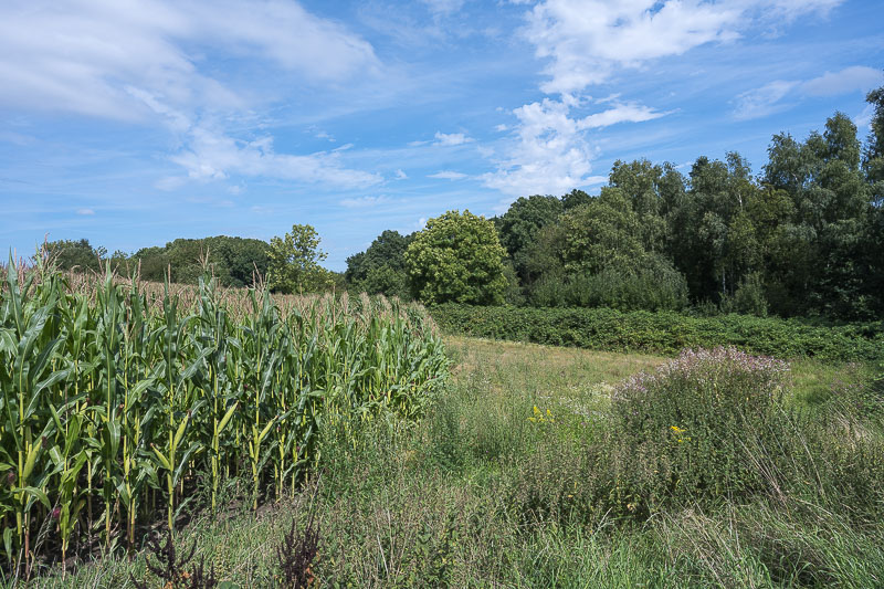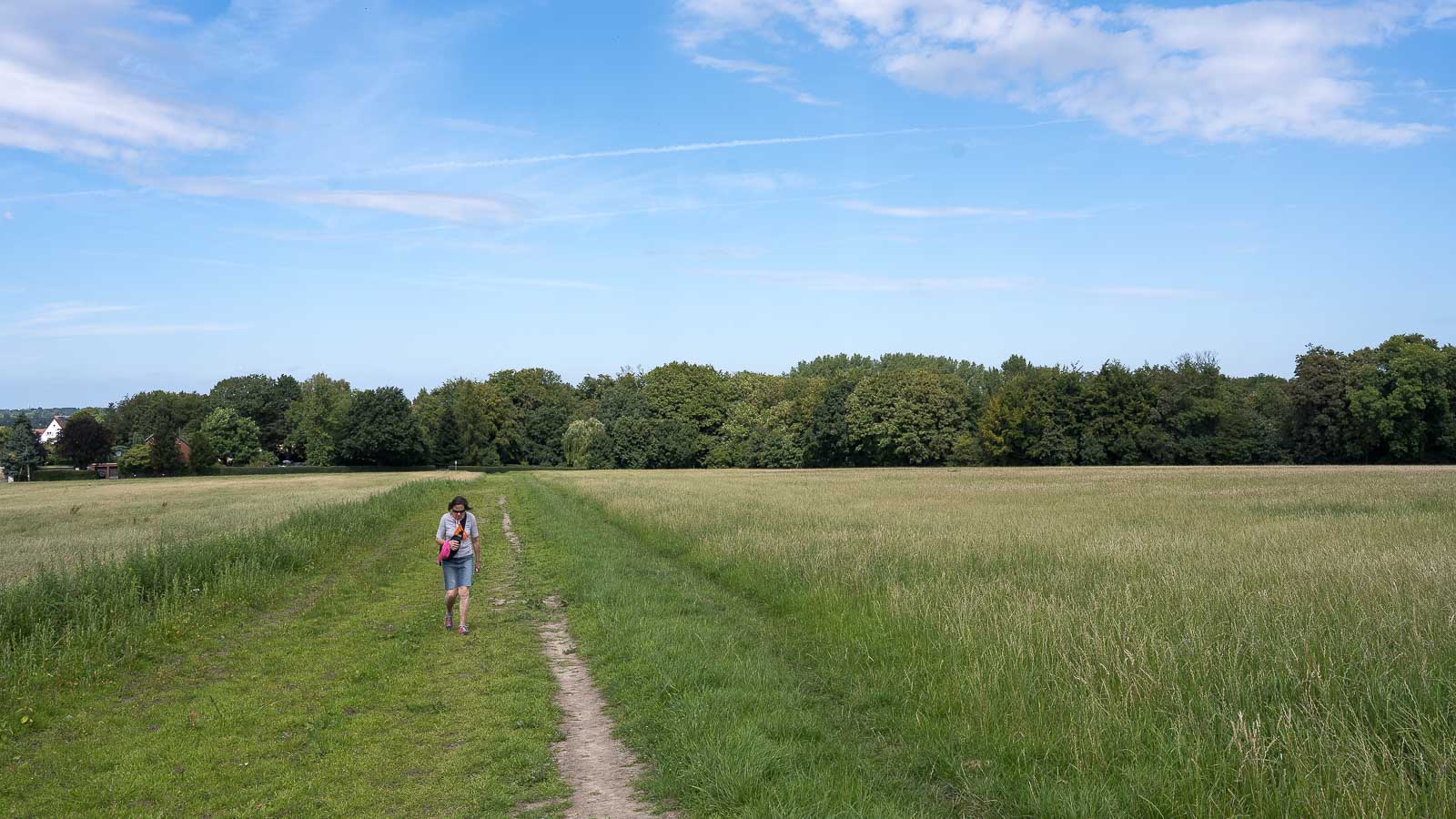 Von dort aus starteten wir die Rundwanderung entgegengesetzt zum Uhrzeigersinn. Die ersten paar Hundert Meter waren nicht so dolle, führten sie doch entlang der Durchgangsstrasse durch den Ort. Diesen verließen wir dann über eine Seitenstrasse und gelangten nach Durchquerung einer Kleingarten Kolonie auf offenes Feld mit Blick über die landwirtschaftlich geprägte, leicht hügelige Gegend.