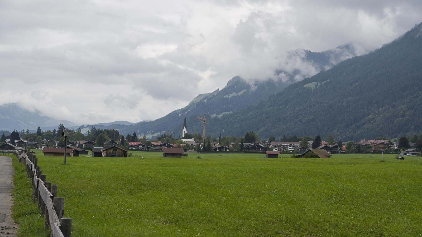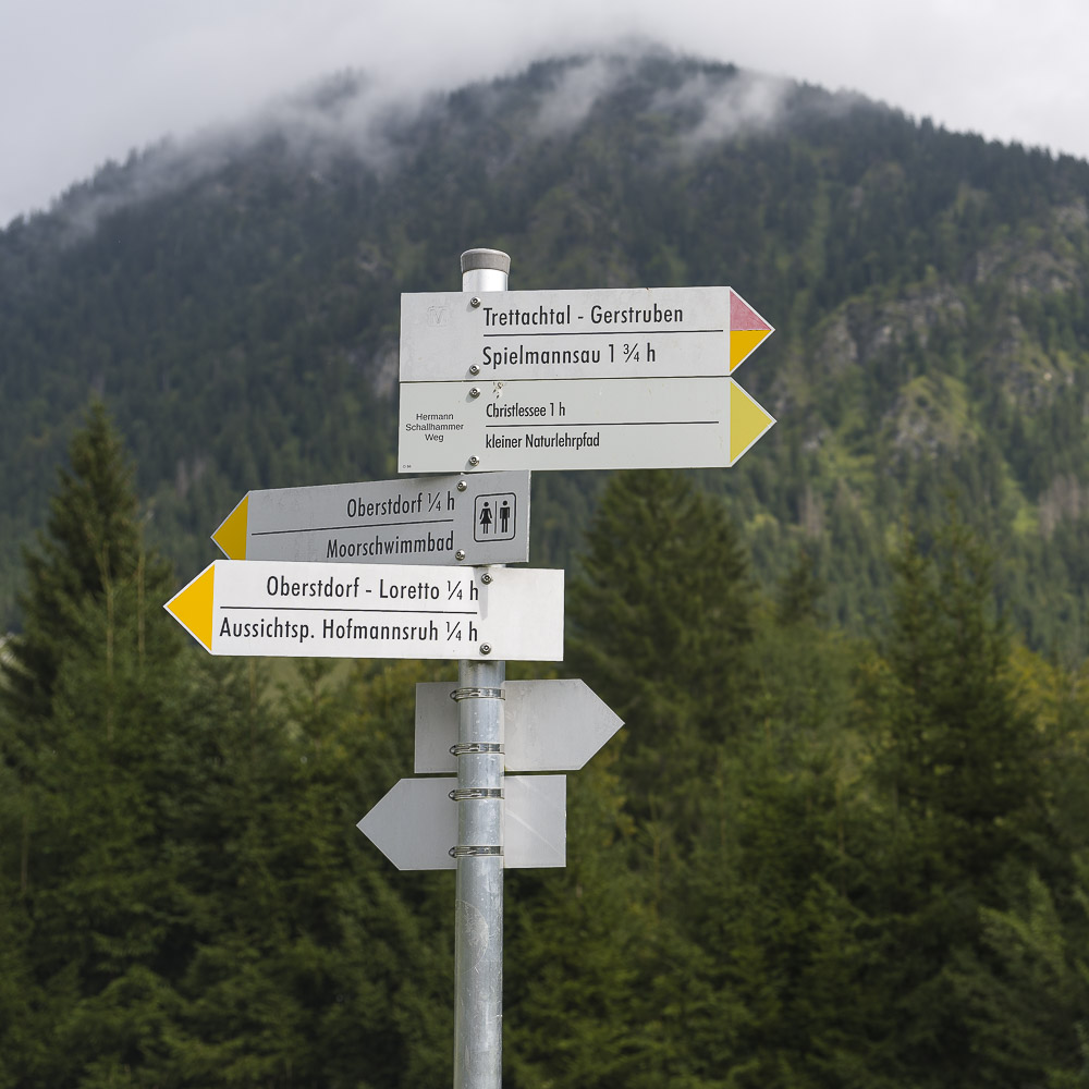 Oberstdorf war gut besucht und es waren zahlreiche Wanderer unterwegs, die froh waren, das es aufgehört hatte zu regnen. Die meisten folgten jedoch den vielen Schildern die mehreren Wanderwegen entlang der Trettach galten. Wir nahmen einen breiten Weg der uns unbeschildert leicht bergauf über zunächst offenes Gelände führte.