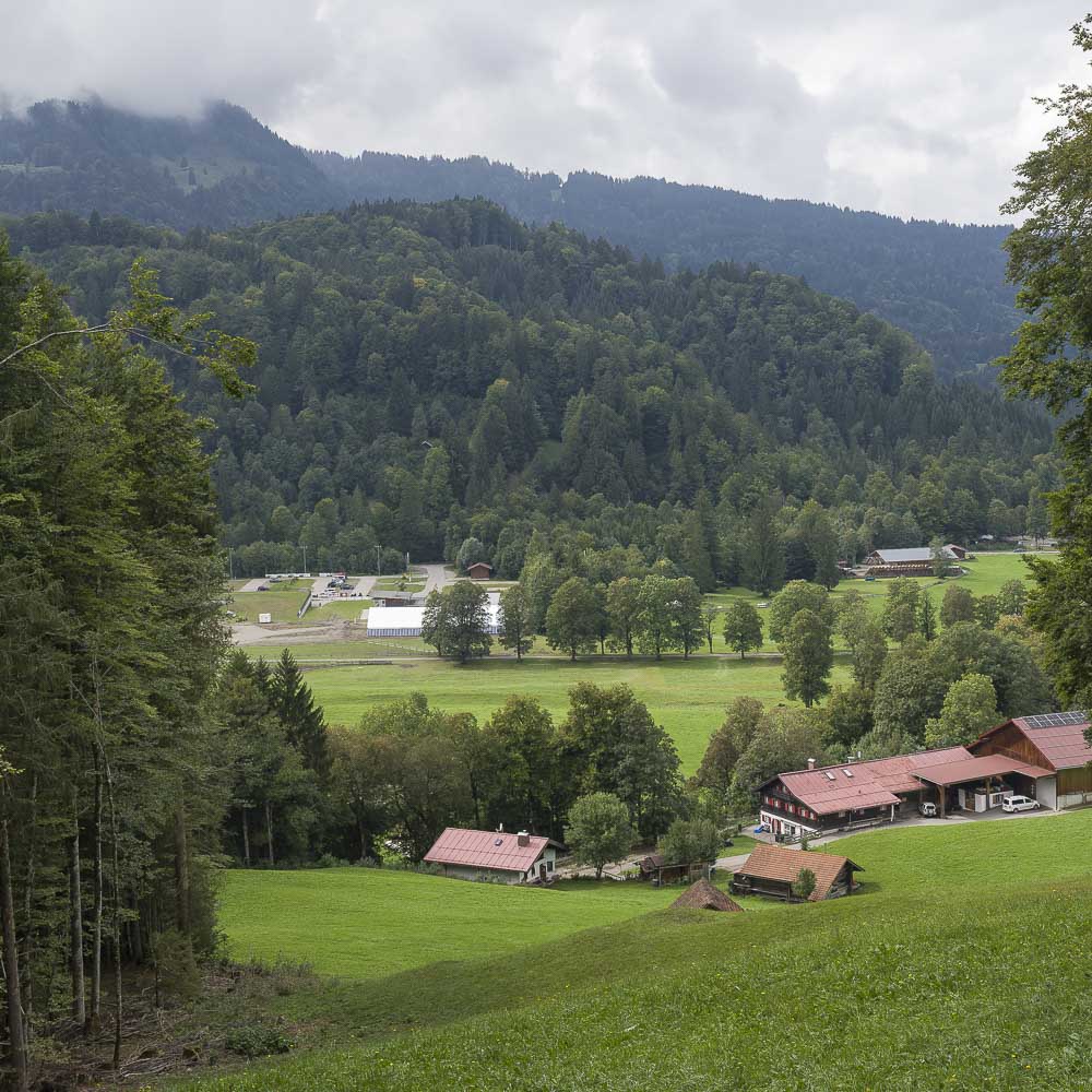 So langsam kam sogar gelegentlich die Sonne heraus und ich konnte einige passable Bilder machen. Kurz nach Verlassen eines kleinen Wäldchens machten wir einen kurzen Schlenker abseits des eigentlichen Tracks und suchten einen auf der Karte gefundenen Aussichtspunkt auf. Der war leider zugewachsen und wir sahen nur einige zu groß geratene Bäume die uns die Aussicht auf Oberstdorf versperrten.
