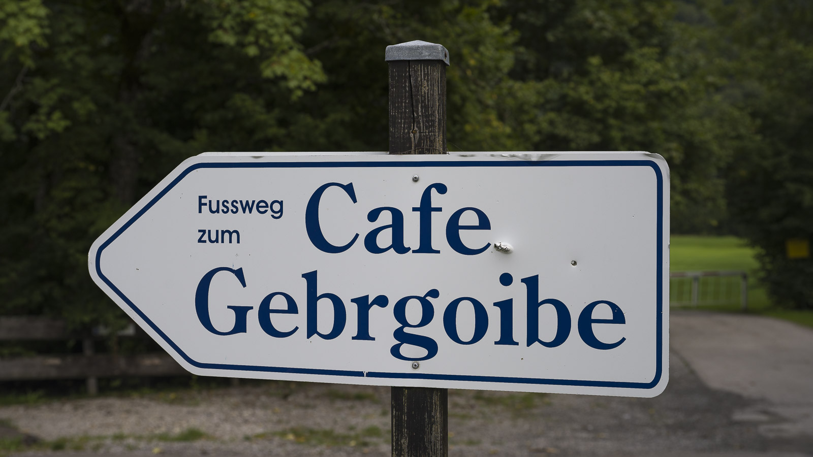 Hinter dem Weiher ging es eine längere Strecke durch einen Mischwald entlang des Oberstdorfer Golfplatzes. Dort gibt es ein Café für welches auf ein par Schildern Werbung gemacht wurde. Auf einigen Wegweisern war es als geöffnet angegeben. So machten wir dann am Waldausgang, nach Erreichen eines kleinen Sträußchens, einen Abstecher in Richtung „Golfplatz-Café“. Das hatte jedoch leider geschlossen, trotz der zuvor gesehenen „haben geöffnet“ Schilder.