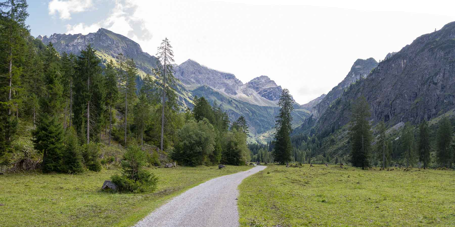 Ein Blick auf die Open Street Map auf meinem Handy zeigte mir, daß es weiter hinten im Tal noch eine weitere Einkehrmöglichkeit geben müßte. So liefen wir noch 2 km bis zur Unteren Gutenalpe und genossen unterwegs das schöne Bergpanorama.