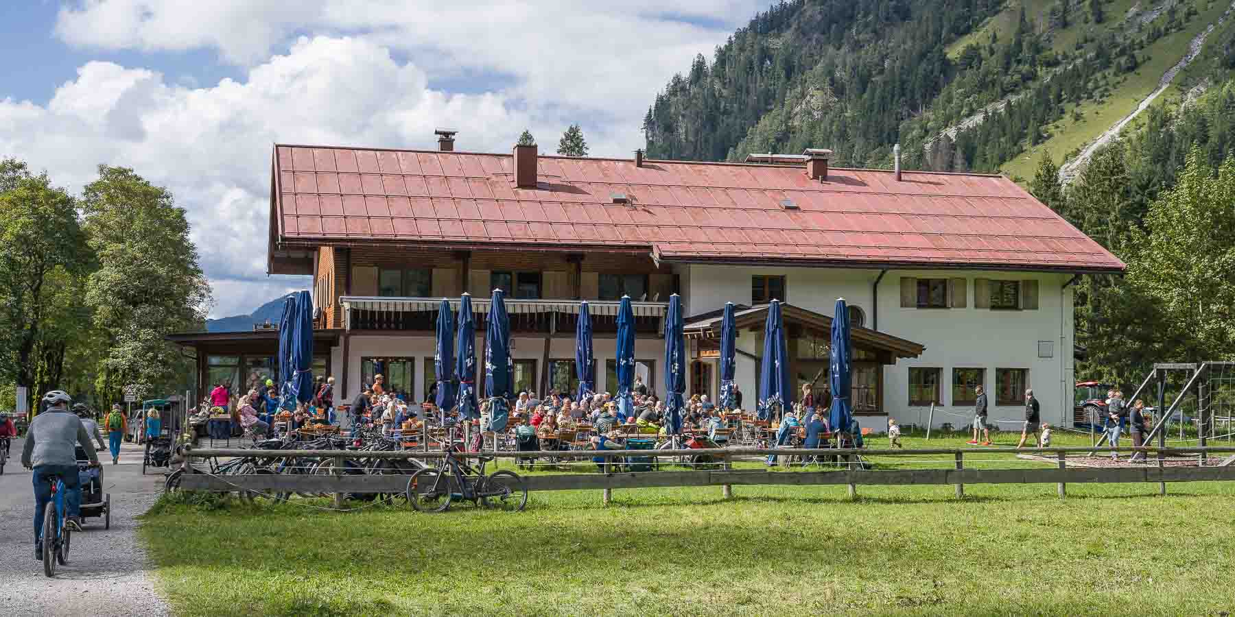 Kurz vor dem Berggasthof Oytalhaus weitet sich das Tal zu einer Alm auf der Viehwirtschaft betrieben wurde (siehe Beitragsbild). Bis zum Oytalhaus waren wir etwa 6 km unterwegs. Wenn wir der Empfehlung unseres Wanderführers gefolgt wären, so hätten wir hier den End- bzw. Umkehrpunkt unserer Wanderung erreicht. Das Gasthaus war gut besucht, um nicht zu sagen überlaufen. Es ist auch gut per Fahrrad (über eine andere Strecke) zu erreichen.