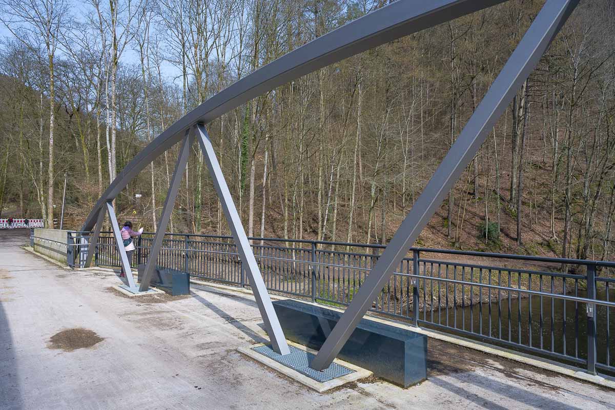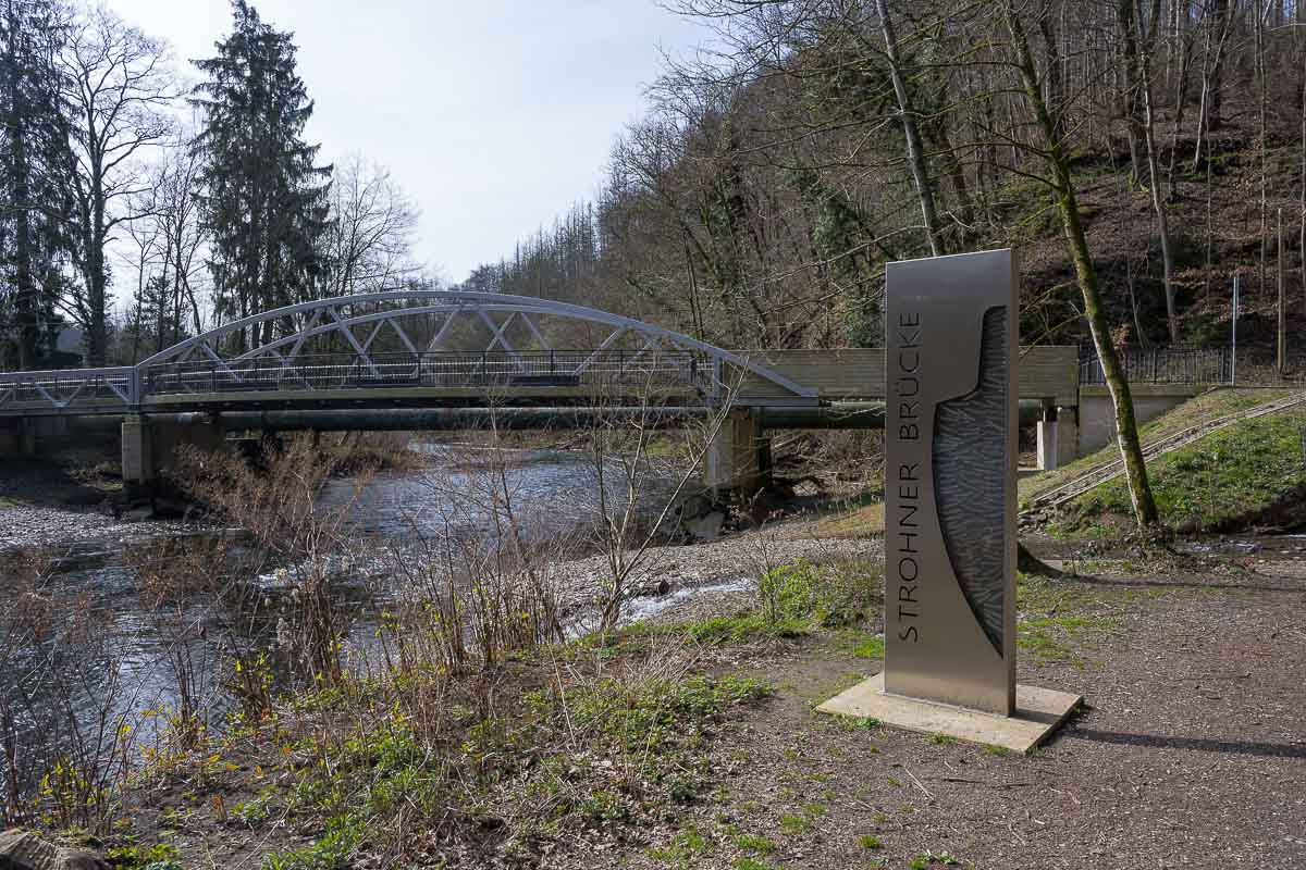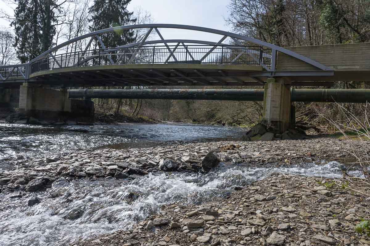 Wandermöglichkeiten gibt es von dort massenhaft wie ein Bild der entsprechenden Wegmarkierungen zeigt. Wir liefen vorbei an einer Station der Stadtwerke Solingen in der das Wasser der naheliegenden Sengbachtalsperre zu Trinkwasser für Solingen verarbeitet wird. Danach überquerten wir die Wupper über die vor ca. 2 Jahren fertig gestellte, neue Wupperbrücke. Die alte war für einige Jahre wegen Baufälligkeit gesperrt gewesen.