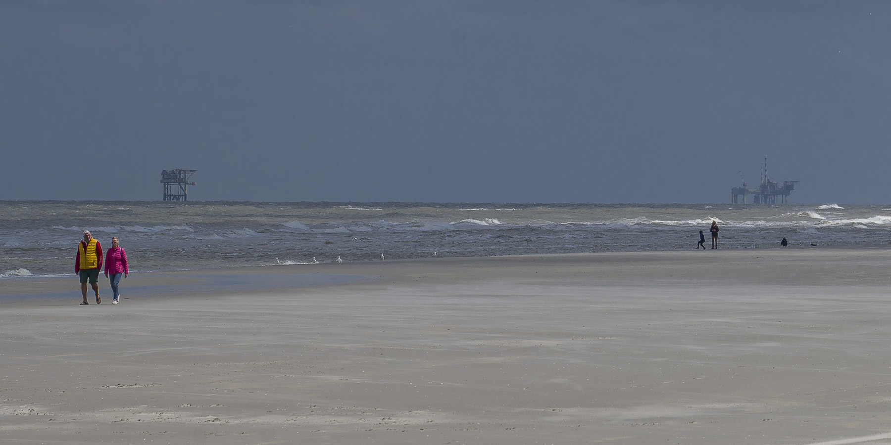 Frisch gestärkt starteten wir nach einer halben Stunde den Strand-Teil unserer Wanderung. Das Wetter war frisch und windig, aber wegen der meist vorhandenen Sonne besser als befürchtet. In nordöstlicher Richtung konnte man in der Ferne 2 Bohrinseln ausmachen. Wegen des Windes waren wir froh nach knapp 2 Kilometern den Strand verlassen zu können.