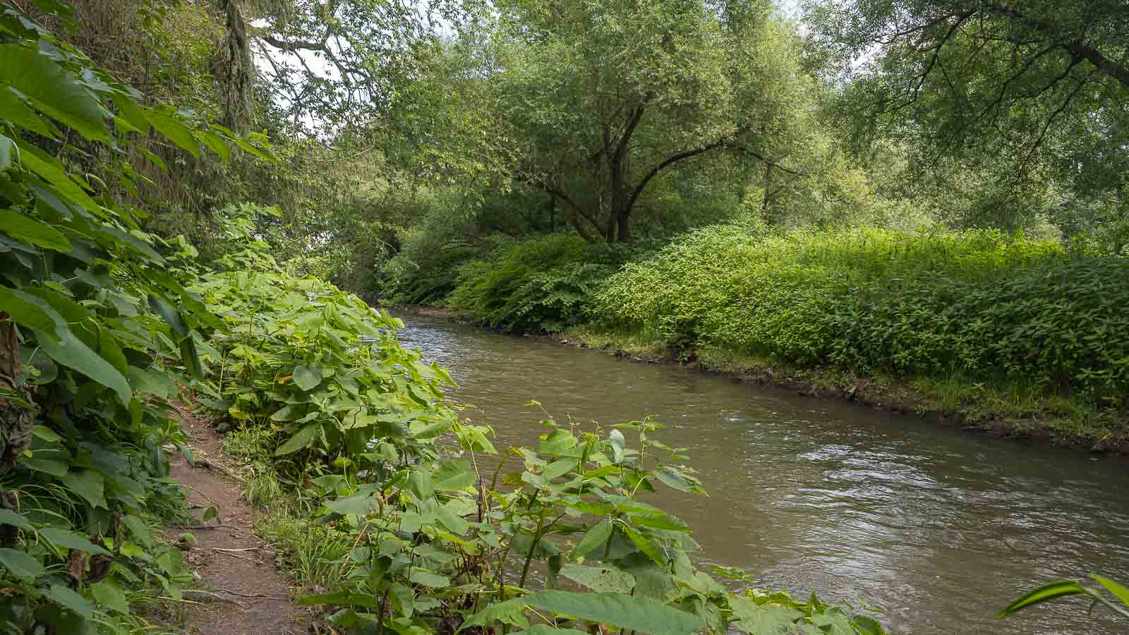 In Hoffnungsthal durchwanderten wir den Ort und überquerten erneut die Sülz. Danach mußten wir etwa 300 m entlang der Durchfahrtsstraße laufen. Hinter einer Bahnunterführung bogen wir scharf links ab und erreichten nach etwa 150 m die Sülz. Hier führte ein schmaler Trampelpfad direkt am Ufer entlang. Man mußte etwas aufpassen das man nicht in den Bach fiel. Alles in allem war dies aber der schönste Teil der ganzen Wanderung.