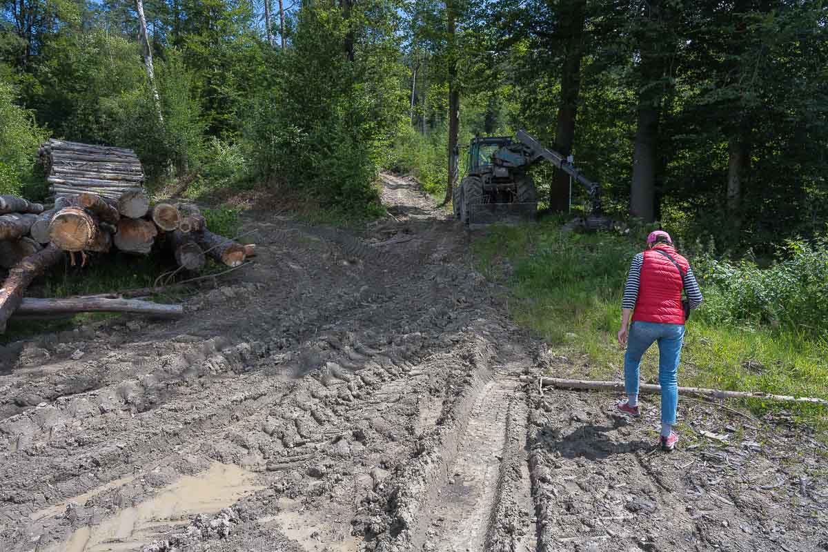 Bei dem Weg zurück auf die Höhe hatten wir Glück, daß es in den letzten Wochen nicht mehr so viel geregnet hatte. Der breite Waldweg war stark zerfurcht durch schweres Gerät welches für Rodungsarbeiten verwendet wurde. Bei „matschigerem“ Wetter hätten wir hier definitiv umkehren müssen. Leicht erschöpft wegen des Auf und Abs kamen wir schließlich oben an und drehten noch eine Runde durch den Ort.