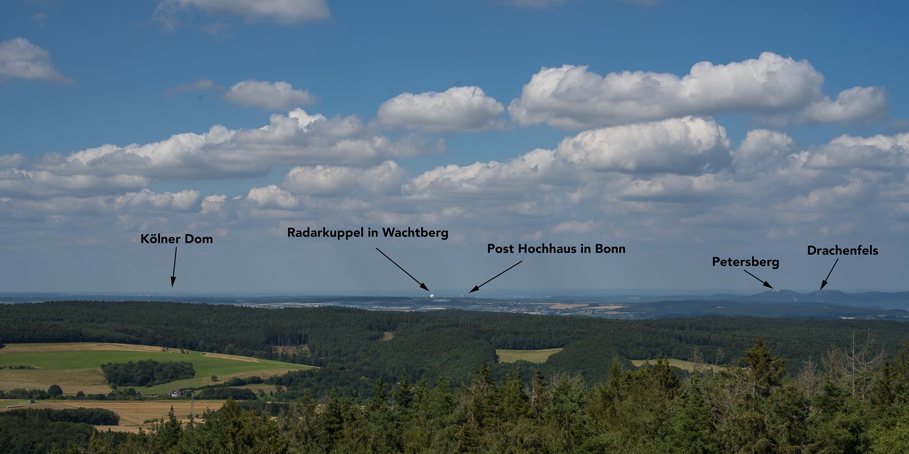 Auf dem Gipfel des Weiselsteins gibt es eine Wacholderheide, das Heidekraut dort hatte gerade begonnen zu blühen. Den Aussichtsturm auf dem Weiselstein mußten wir natürlich auch besteigen. Die Aussicht von dort ist einfach Klasse. Ich hatte kein Fernglas dabei, so daß ich erst zu Hause am PC auf den entsprechend vergrößerten Bildern erkennen konnte was man von dort alles sehen kann. In der Ferne konnte ich im Dunst sogar den Kölner Dom erahnen.