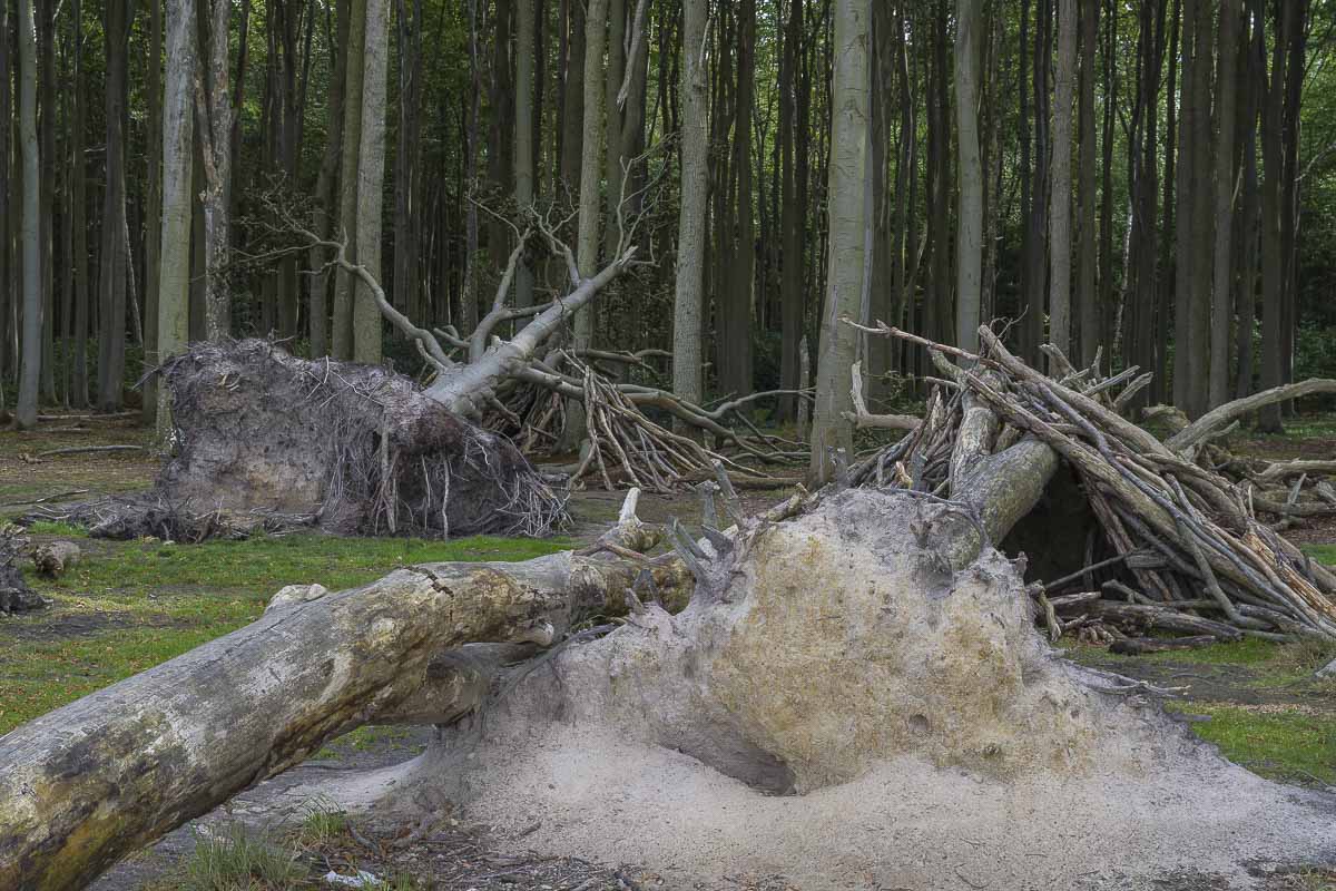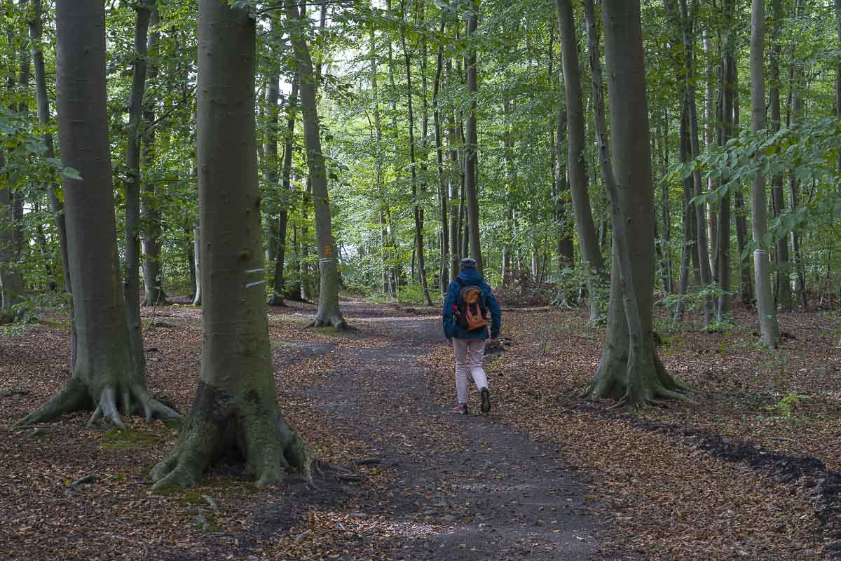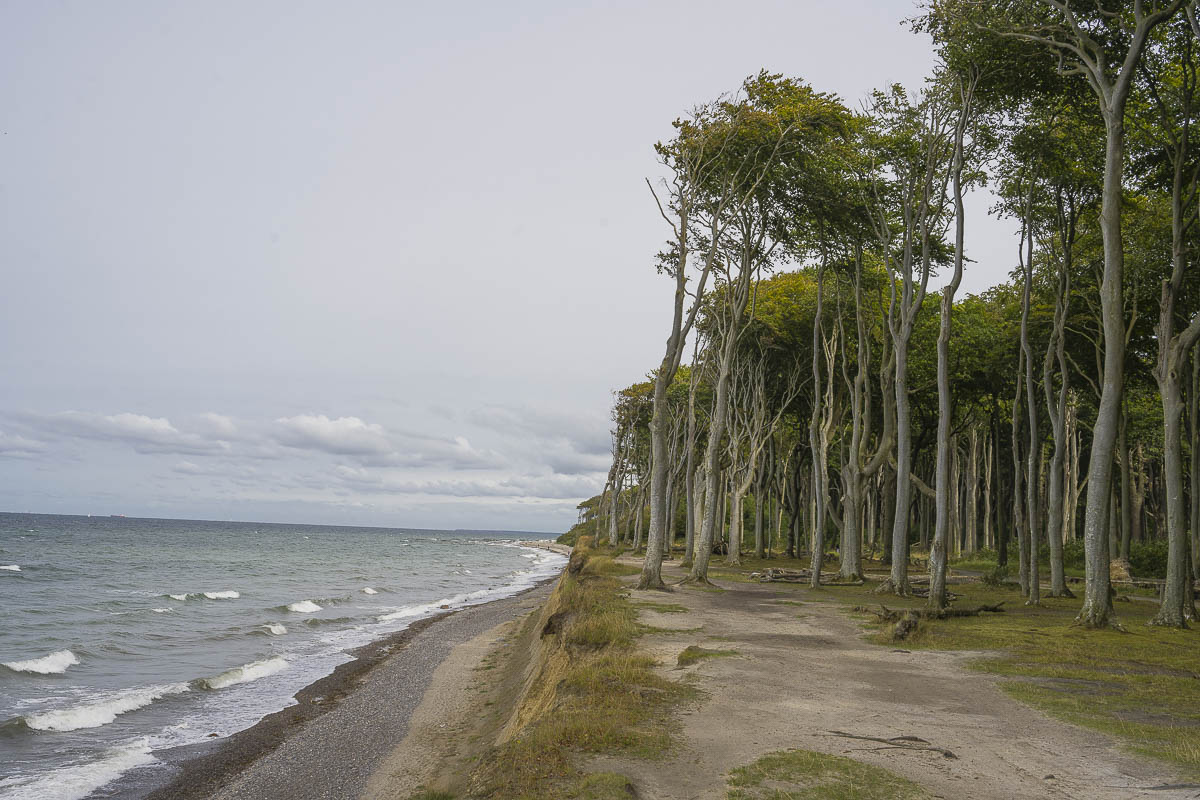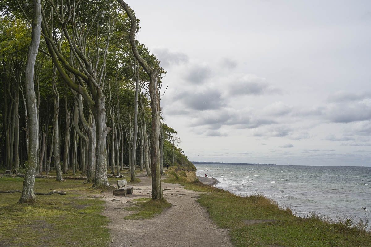 Um auf den Rundweg durch den Küstenwald zu kommen, mußten wir zunächst einen etwa 500 m langen Zuweg absolvieren. Dann ging es durch den Wald bzw. an dessen Rand entlang. Das Wetter war bedeckt was für die Waldfotos ganz passend war. Bis etwa 100 m zur Küste hin war es ganz normaler Laubwald. An der Steilküste haben sich dann aufgrund des permanenten Windes und der salzhaltigen Luft die charakterlichen Baumformen oberhalb der Steilküste ausgebildet.
