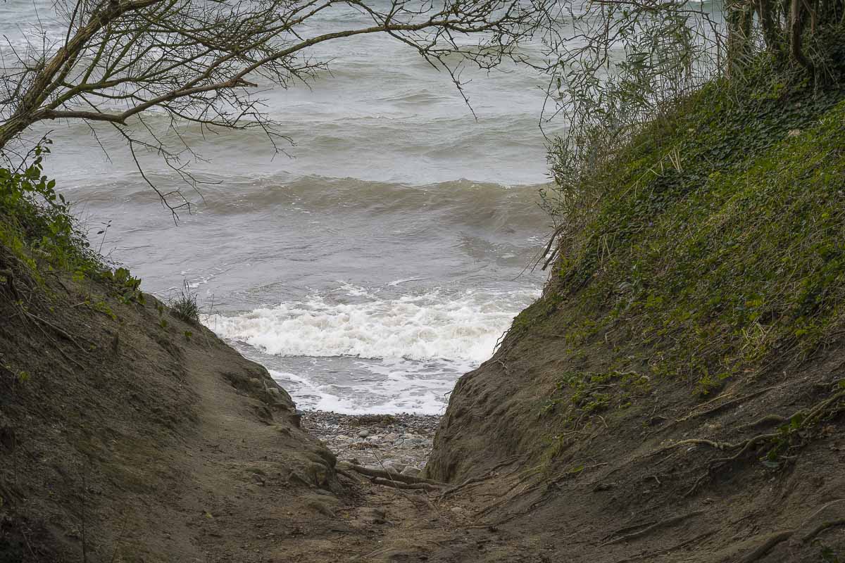 Auffallend für uns war, das der Wind tatsächlich erst kurz vor der Küste einsetzte. Vorher herrschte im Wald fast Windstille, wofür es am Meer aber umso kräftiger blies. An der Küste angekommen, führte der Weg oberhalb der Steilküste mit schönem Blick über das Meer entlang.