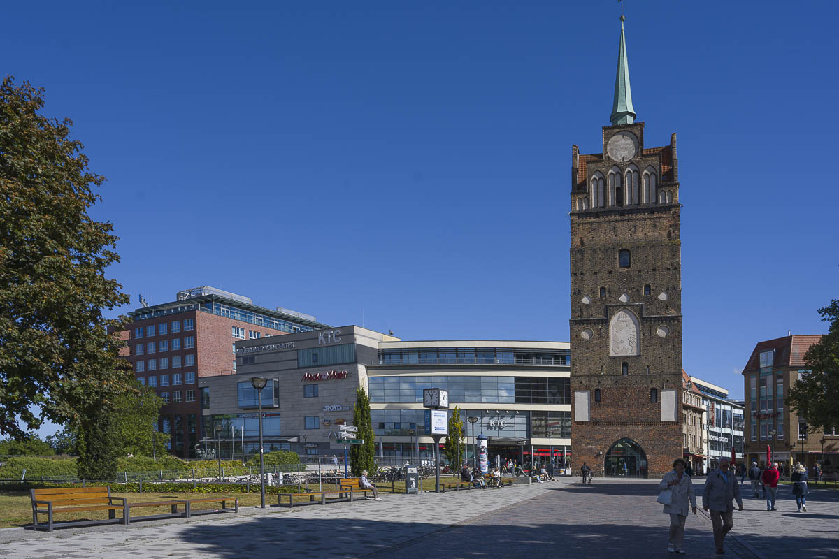 Mit der RB11 fuhren wir um 10 Uhr 30 in 21 Min. von Bad Doberan Bahnhof nach Rostock Hbf. Von dort mußten etwa 500 m laufen um Anschluß an den vorgesehenen Track zu finden. Durch einen Park (Rosengarten) erreichten wir das Steintor.