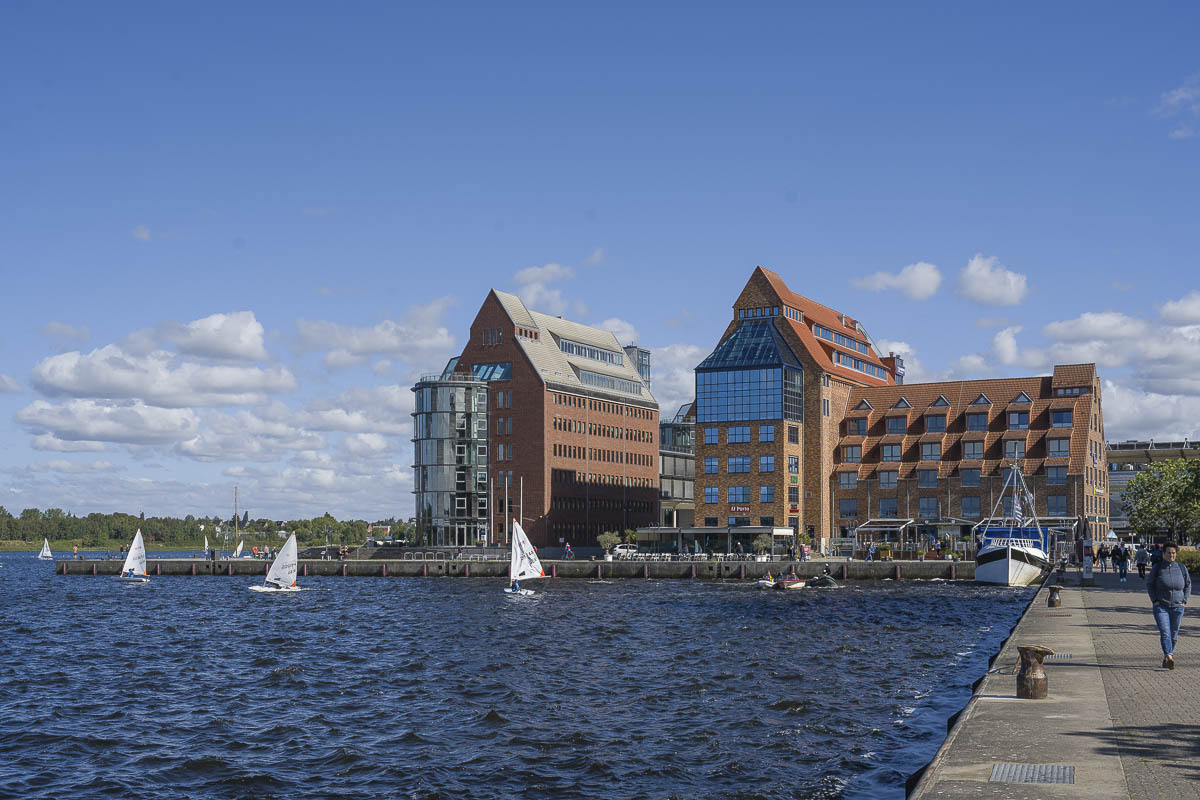 Schließlich verließen wir das Warneufer und wanderten ein ganzes Stück entlang der Stadtmauer (sehr schön). An der Ernst Barlach Brücke mussten wir erneut mächtig improvisieren, da eine Unterquerung der Brücke wegen einer Baustelle nicht möglich war. Überhaupt hatte ich den Eindruck, daß in Rostock mächtig gebaut wird. Es gab zahlreiche schicke Neubauten, die alle in den letzten Jahren errichtet worden waren und es kommen laufend welche dazu.
