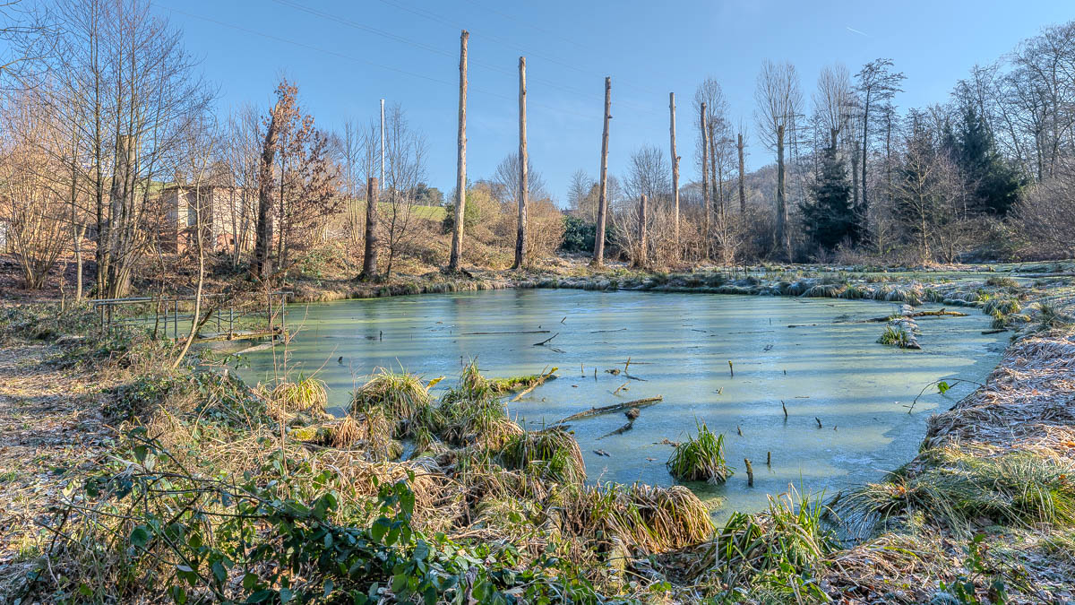 Unser Wanderweg verlief oberhalb des Wiembaches. Von oben konnten wir einige Fischteiche sehen. Einer davon war zugefroren (siehe Beitragsbild). An einigen Stellen konnte man runter zum Bach gehen, was ich dann auch für einige Fotos machte. Zum Glück war der Boden gefroren, sonst wäre es doch recht matschig geworden. Vor allem weil hier vor einiger Zeit mit schwerem Gerät Baumfällarbeiten durchgeführt worden waren. Hoffentlich wird der Weg wieder etwas hergerichtet, sonst sehe ich hier für die Wandersaison im Frühjahr schwarz.