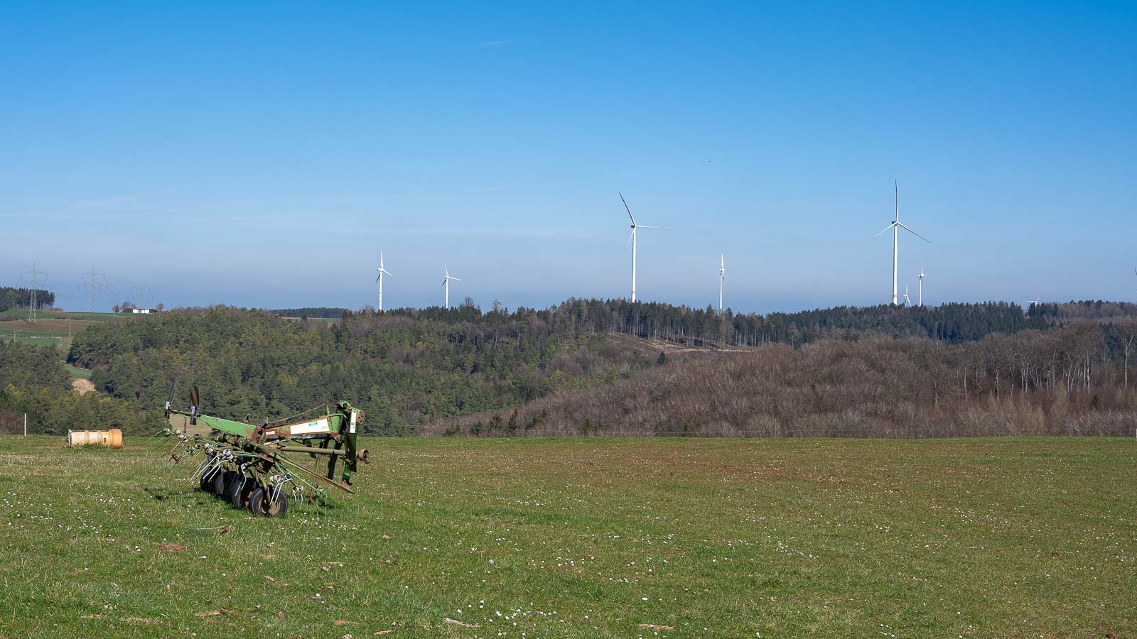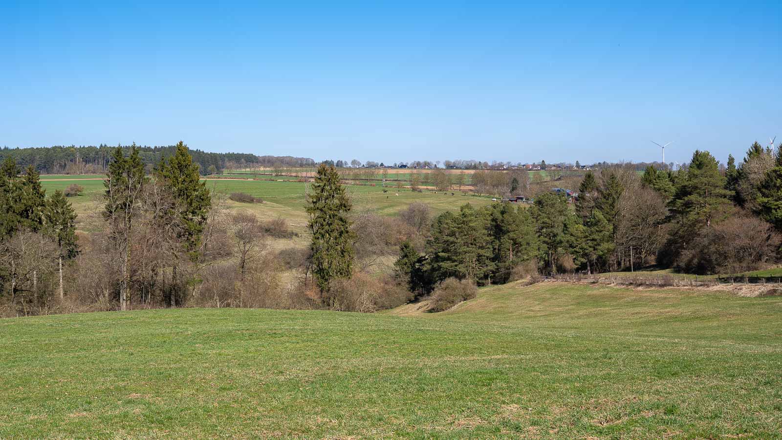 Nach dem Geistal NSG führte der Weg leicht bergauf, vorbei an einigen größeren Bauernhöfen erneut bis zur L206. Diese wurde überquert und danach ging es in den Wald hinein. Mit ca. 500 m lagen hier die höchsten Punkte meiner Wanderung in flachem Gelände. Nach Verlassen des Waldes fand ich eine Bank für meine Mittagspause auf der ich dann meine Marschverpflegung verzehrt. Trotz des schönen, sonnigen Wetters war es hier recht frisch, sodaß ich mich nicht lange aufhielt.