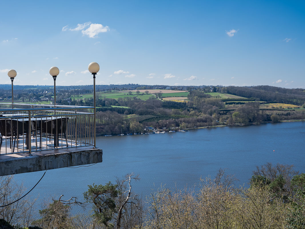 Wir liefen die Runde wie vom WF vorgesehen entgegengesetzt zum Uhrzeigersinn. Dabei kamen wir schon bald am Restaurant Heimliche Liebe vorbei. Die Speisekarte sah recht vielversprechend aus und die Aussicht von der Terrasse aus über den Baldeneysee ist herrlich.