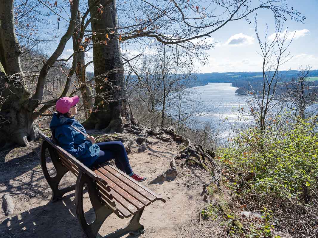 Wir zogen weiter und genossen die Aussicht auf den See, auf dem schon einige Schiffchen unterwegs waren. Einen letzten Aussichtspunkt über den See gab es an der Korte Klippe. Danach verließen wir den Wanderweg oberhalb des Sees und tauchten in den Schellenberger Wald ein. Diesen durchquerten wir auf breiten Wegen und gelangten zum Schloß Schellenberg. Hinter dem Schloß liegt die Augustinum Seniorenresidenz, eine riesige Anlage mit vielen Wohneinheiten und allerlei Serviceeinrichtungen.