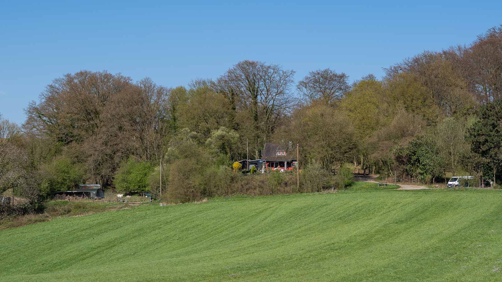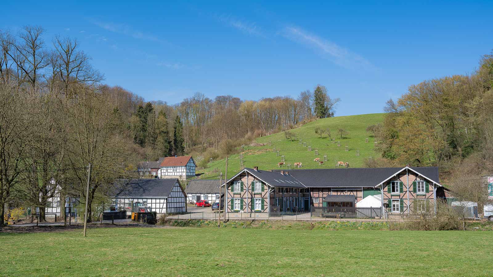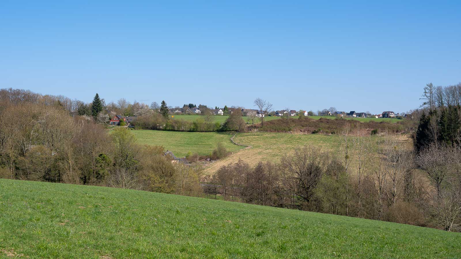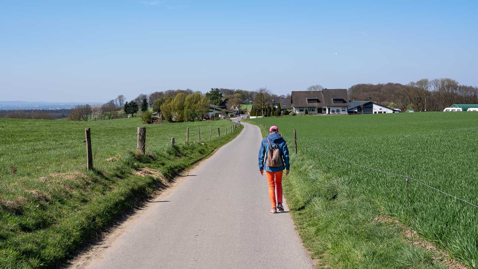 Heute kamen wir zum Essen an diesem einladendem Ort viel zu früh vorbei, außerdem hatten wir unsere Marschverflegung eingepackt. So setzten wir unser Wanderung fort, verließen das Strundetal und erklommen die hier noch recht flachen Bergischen Höhenzüge. In der Nähe des Wanderparkplatzes Altehufe hatten wir den höchsten Punkt der Wanderung erreicht und genossen ab hier das tolle Panorama.
