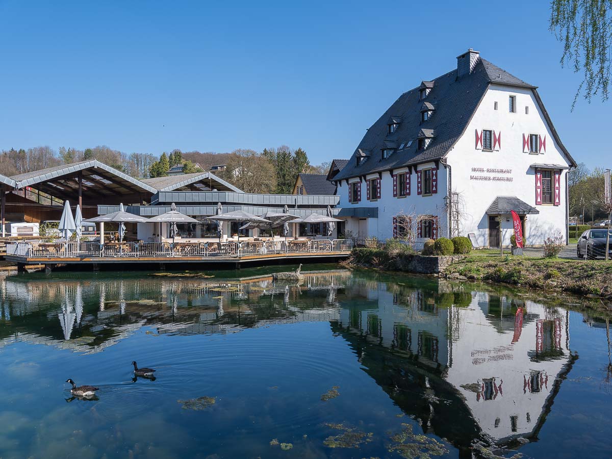 In Herrenstrunden schauten wir am gleichnamigen Teich vorbei und machten für ein Foto einen Abstecher zur Malteserkomturei. Hier ist ein vorzügliches Restaurant mit Terrasse an einem schönen Teich untergebracht. Das Restaurant kann empfohlen werden, vor einigen Jahren machten wir hier nach einer Wanderung den „Einkehrschwung“.