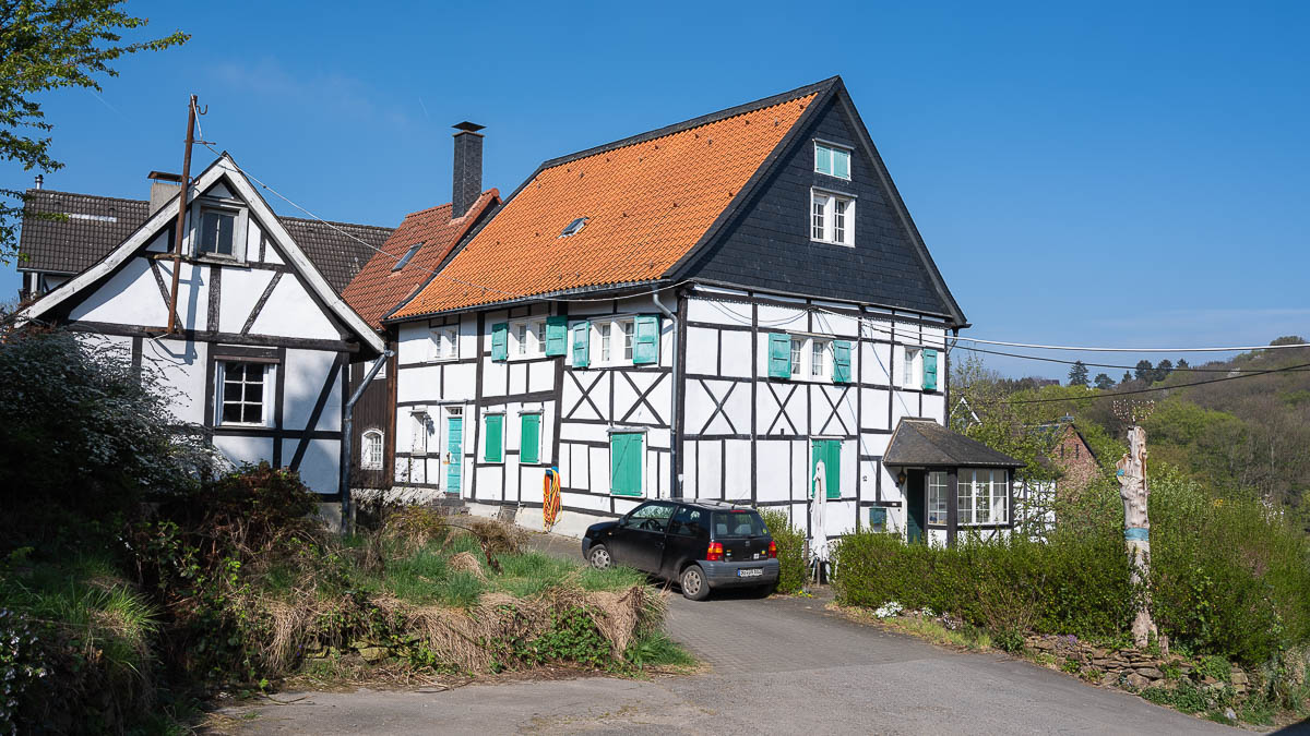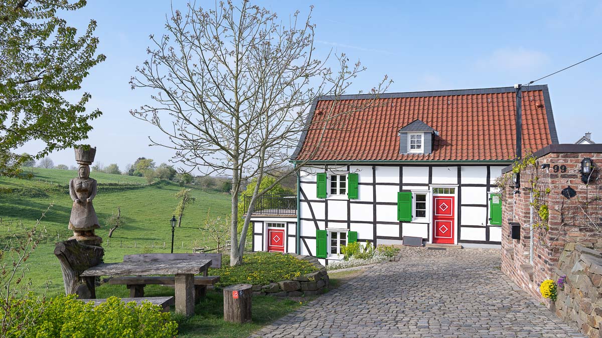 Bei Friedrichshöhe hatte ich den größten Teil der Steigung hinter mich gebracht und genoß von dort die schöne morgendliche Aussicht. Über weitgehend offenes Gelände ging es weiter bis zum Solinger Ortsteil Lache. Hier kam ich an einem schönen Fachwerkhaus mit einem tollem kleinen Rastplatz vorbei. Das ganz Ensemble (siehe Beitragsbild) wurde gekrönt von der holzgeschnitzten Statue einer Liewerfrau.