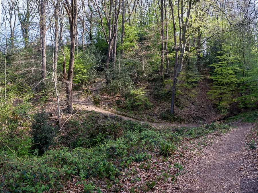 Ich wanderte die Runde entgegengesetzt zum Uhrzeigersinn, was sich auch dringend empfehlen würde. Zunächst ging es auf bekanntem Fahrweg parallel zur Wupper. Nach etwa einem Kilometer zweigte die Strecke nach links (siehe Bild) ab und führte die Wupperberge hinauf. Diese Teilstück ist recht steil und ich würde es nicht so gerne bergab laufen wollen, alles in allem aber gerade noch so Ü70 tauglich.