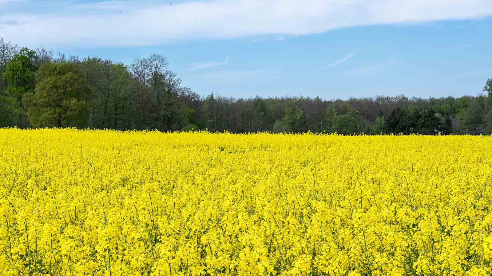 Anschließend machten wir noch eine weitere Abkürzung und sparten dabei etwa 1.5 km. Bei Kellersdiek/Köpperschall wichen wir erneut vom Track ab, unterquerten eine Bahnlinie und kamen so auf offenes Gelände mit einem großen blühendem Rapsfeld. In der Nähe des Blauen Sees machten wir noch einen Schlenker zur Naturbühne Blauer See. Dort erhofften wir uns eine Pausenbank auf der wir unsere Marschverpflegung verzehren wollten. Das war leider nichts, denn das ganze Gelände war abgesperrt und weit und breit war keine Bank zu sehen. Auch die Aussicht auf den Blauen See war sehr bescheiden.