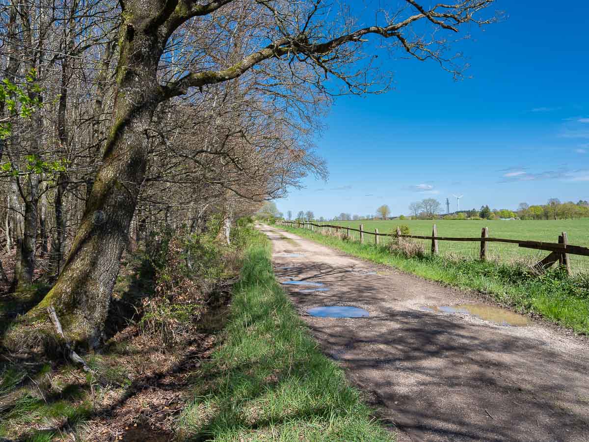 Nachdem wir die L 204 überquerten führte der Wanderweg ein ganzes Stück entlang der Kreisstraße K 76. War zwar nicht schön, aber viele Autos begegneten uns dort nicht. Apropos Begegnungen : Selten sind wir eine Strecke gelaufen auf der so wenig los war. Von den Ortschaften mal abgesehen sahen wir keine Wanderer, Gassigeher oder ähnliches. Lediglich drei mal kamen uns ein par Radfahrer entgegen.